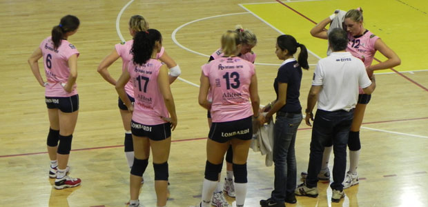 La Pomì inizia con questo sestetto: Bacchi, Nardini, Corna, Beier, Gibertini, Zago. Inizio equilibrato: 4-2 Pomì.