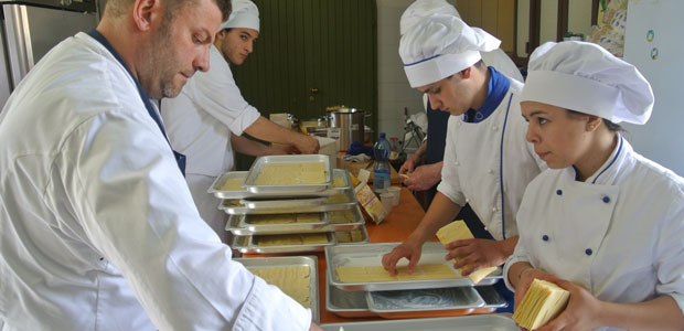 Tanti, infatti, erano i ragazzi presenti, giovanissimi, tutti vestiti da cuochi provetti, pronti a dare una mano. Proprio gli studenti della scuola alberghiera avranno così la possibilità di sperimentare sul campo la vita della cucina, accanto a grandi chef, famosi a livello internazionale. Nella fattispecie, questa mattina, i ragazzi hanno sbucciato le fave e preparato la base per le lasagnette, che rientrano ovviamente nel menù pensato da Gianluca Angelini.