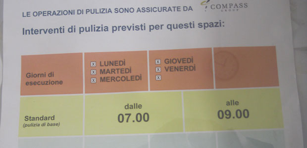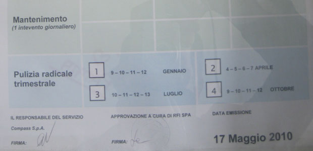 La stazione di Casalmaggiore, oltre all’obliteratrice rotta dopo una settimana dalla sua installazione, è priva del tavolo, un grosso pezzo d’arredamento in noce che qualcuno il giorno di Pasqua ha pensato bene di far sparire. Tornando alle pulizie il colmo dei colmi è rappresentato da un cartello appeso alla parete, dove le Ferrovie dello Stato annunciano che le pulizie sono affidate ad una determinata ditta con i vari giorni di intervento e il timbro di verifica e controllo. Peccato che quel cartello porti la data del 17 maggio 2010, quasi tre anni fa.