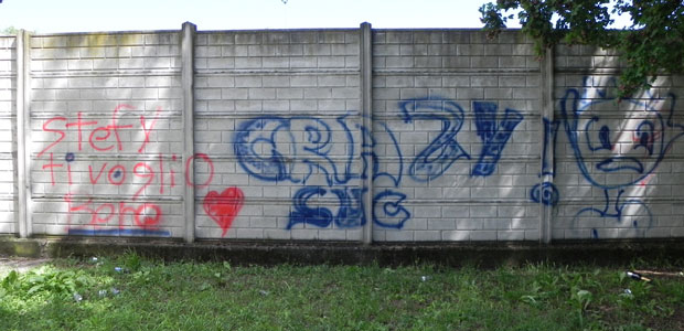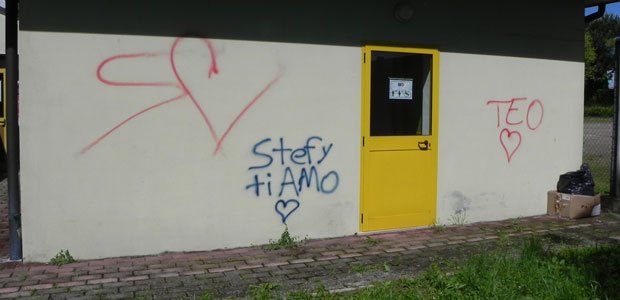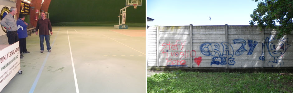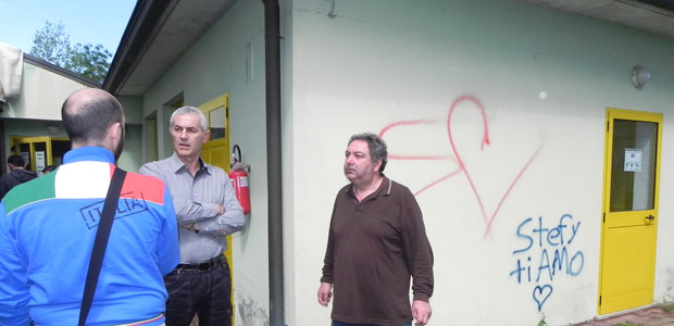 Su parte del muro e del tendone esterni della palestra, ma anche sulla muraglia del campo da calcio comunale, sono state verniciate scritte e disegni.
