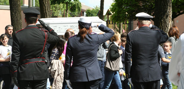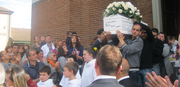 Le hanno lanciate in cielo due colleghi di Paolo, il padre del bambino, con le lacrime agli occhi mentre i parenti più stretti non interrompevano di accarezzare il legno bianco completamente ricoperto di scritte, dediche commoventi e firme applicate col pennarello nero, sia da parte dei compagni di scuola di Raffaele, che degli amici più intimi. “Un bacione, mamma, papà, Lorena”, si leggeva sul fronte della piccola bara, portata a spalla dalla casa dei Tangari, in quartiere San Zavedro, fino alla chiesa parrocchiale.