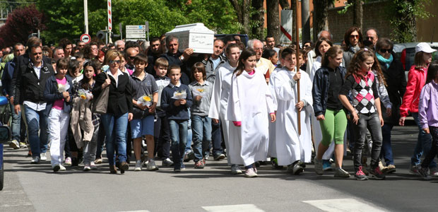 Sobria e contenuta l’omelia di don Mario Binotto, parroco di San Giovanni in Croce, affiancato da don Alfredo Valsecchi, parroco di Casteldidone, che già aveva celebrato la messa di suffragio con tutte le scuole mercoledì scorso. Al parroco è piaciuto l’idea delle firme sulla bara: “Avete fatto un bel gesto, come se Raffaele fosse un documento. Con la vostra firma voi avete detto, Raffaele noi siamo con te per l’eternità”. Don Mario poi ha proseguito, evidenziando che per accettare queste  dolorose scelte del destino occorre avere una grande fede, aggiungendo che per Raffaele non ci sarà più morte, nè sofferenza, nè affanno, nè dolore, perché la parola di Dio abiterà per sempre con lui. Nell’amore della folla per Raffaele, don Mario ha rivisto l’amore di Maria per Gesù Cristo sulla croce. Al termine della liturgia qualche bambino ha voluto ricordare l’amico: “Ora farai gli scherzi agli angeli, come facevi a noi. Seguici da lassù, perché ci manchi”.
