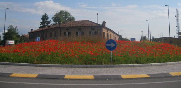 A proposito di rotonda Coand, questa è l’unica che si presenta in ordine e perfettamente sfalciata. Forse perchè è affidata ad un vivaista mantovano che mette la sua pubblicità sull’elegante manto erboso.