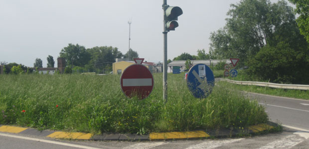 Ciuffi e cespugli così alti da arrivare tra poco a nascondere persino la segnaletica verticale. Oltre a rendere pericoloso il transito  dei veicoli: in diverse rotatorie la visibilità è ostacolata a tal punto dal rendere impossibile vedere le auto che girano attorno all’anello.