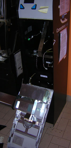 Nella foto, la macchinetta cambiasoldi svuotata dai ladri