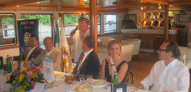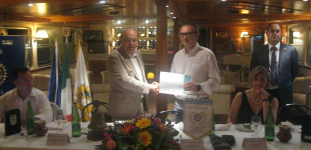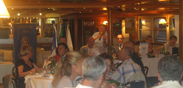 Scopiettante come i fuochi d’artificio che hanno concluso la prima conviviale organizzata dal nuovo presidente Mario Fazzi. L’annata del Rotary Club Casalmaggiore Viadana Sabbioneta si preannuncia carica di iniziative accattivanti e coinvolgenti cosi com’è nell’indole giovanile e determinata del neo presidente. Già il prologo si è manifestato con i crismi delle novità e della voglia di catturare la partecipazione dei soci con una serata inedita e particolare. Al posto del solito ristorante la conviviale organizzata a bordo di una motonave salpata alle 20 dal molo di Viadana per toccare l’argine del fiume a Casalmaggiore e consentire dalla balconata privilegiata della “Stradivari” la visione dei fuochi d’artificio che la Pro Loco di Casalmaggiore organizza ogni anno a conclusione delle locale fiera estiva. “Abbiamo chiesto al comandante di evitare qualsiasi manovra che potesse rappresentare il simbolico inchino verso l’argine di Casalmaggiore” ha precisato ironicamente Fazzi che poi, sobbalzando come tutti, dopo il tonfo dello scafo attraccato alla banchina, ha aggiunto: “Non preoccupatevi, questo non è il Titanic anche se sentite la musica che continua a suonare”. Il personale a bordo ha accolto gli ospiti con professionalità e preparazione servendo aperitivi per accompagnare il simpatico gesto di un socio, Attilio Pagliari, che ha pensato bene di portare una prova tangibile di quanto di buono prodotto dai suoi suini: un lungo e delizioso salame sotto il braccio. Superfluo aggiungere che il fiume ha regalato le emozioni che si conoscono ma che in pochi sanno valorizzare come gli impareggiabili tramonti o i voli dei gabbiani, delle folaghe e delle anatre alla ricerca dei loro rifugio acquatici. A tale proposito molto interessante è stata la spiegazione tecnica e teorica di quell’esperto cacciatore e ambientalista (i due ruoli non si contraddicono) che è Ercole Montanari. Prima di lui le informazioni sulle caratteristiche della nave le ha date direttamente il comandante della imbarcazione Giuliano Landini che ha spiegato come la Stradivari, lunga 62 metri e larga 10, sia la più grande motonave per navigazione interna d’Italia. FOTOGALLERY
