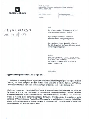 L’assessore regionale Viviana Beccalossi ha risposto all’interrogazione del M5S in merito al dissesto sull’argine tra Viadana e San Matteo, e il nucleo viadanese del movimento invita gli amministratori a procedere. Ecco il testo del comunicato.