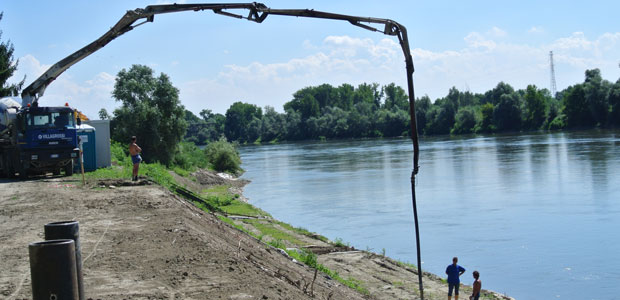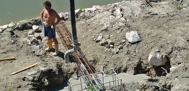 Andiamo con ordine: negli ultimi giorni l’accelerazione c’è stata, eccome. La zona di attracco dell’attracco (perdonate il bisticcio), ossia il punto in cui la struttura in ferro, che tuttora giace, ormai pronta, all’Italian Zeta di Quattrocase, verrà fissata alla riva è stata spianata e sistemata. Poi martedì è arrivata pure la betoniera, da Bagnolo San Vito, che ha consentito la colata di cemento necessaria a fissare i plinti di ancoraggio, tutti realizzati in punti strategici e abbastanza simmetrici rispetto alla struttura in ferro.