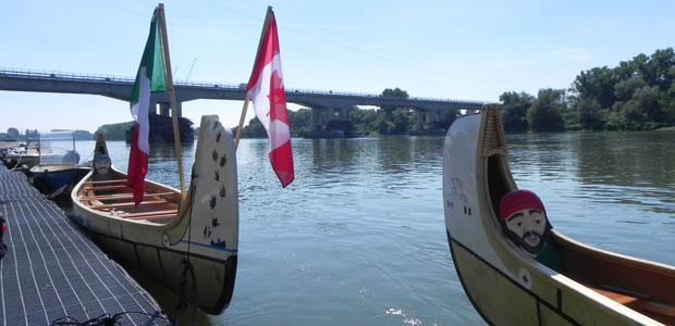 Due canoe, di betulla e cedro, autoprodotte e ben tenute, battenti bandiera canadese e tricolore. Una divisa ufficiale, con tanto di berretto, maglia e pantaloncini in fibra sintetica. Una scritta evidente incollata alle imbarcazioni: “Viaggiatori Canadesi, da Milano a Venezia – 2013”, giusto per non perdere la rotta. Un remo a testa e uno spirito d’avventura, di scoperta e di divertimento che rende unica anche la sosta a Casalmaggiore. “Wonderful!”, esclama una canoista riferendosi al panorama fluviale.