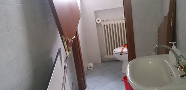 “Questa è la terza volta che mi vengono a visitare” racconta Antonella, la titolare del bar “e quando stanotte sono arrivata qui avevo in mano una spranga di ferro. Se li avessi trovati ancora dentro avrei dato loro una lezione memorabile”. La donna mostra il tragitto compiuto dai due malviventi, che dopo aver tagliato una siepe posta sul retro del locale, sono saliti su un tetto di eternit arrivando al finestrino del bagno da cui sono entrati dopo averne infranto un vetro e spezzato una feritoia in ferro tramite un tronchese (peraltro dimenticato sul water). A quel punto si sono trovati davanti una porta in legno sbarrata dall’interno con un grosso tubo di ferro. Per nulla rassegnati i due hanno segato la porta a metà in modo da aprirsi un varco e arrivare alla saletta delle slot machine, sempre strisciando sul pavimento.