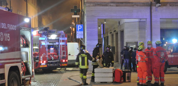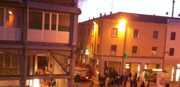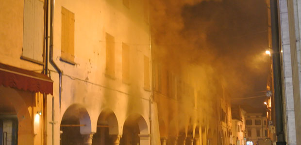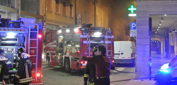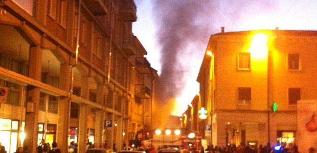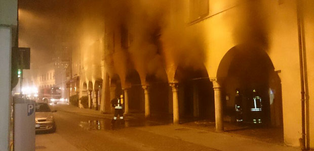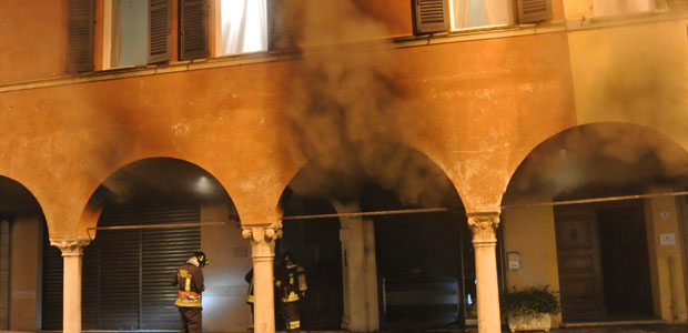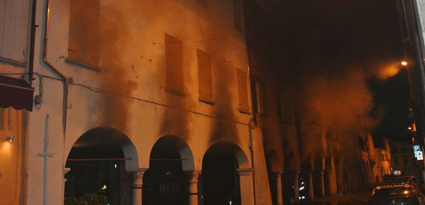 Nella foto, l’incendio nel porticato di via Cavallotti
