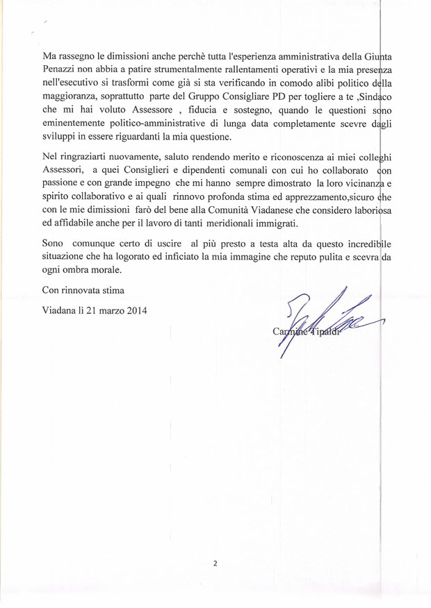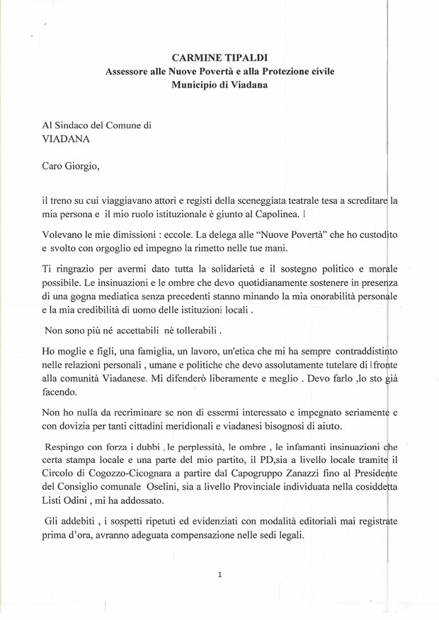 Di seguito pubblichiamo integralmente la lettera di dimissioni di Carmine Tipaldi.