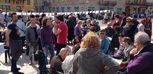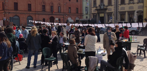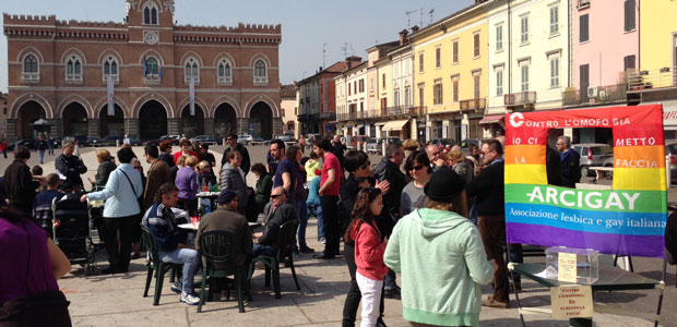Circa 150 persone hanno dunque animato la piazza in un clima conviviale, sedute attorno al “listone” (e non sdraiate a terra come a Cremona, quando si voleva simboleggiare la “morte” creata dall’omofobia) con la presenza di banchetti molto “nostrani”, dove era possibile bere, mangiare e fare semplicemente un aperitivo. Sono stati anche distribuiti volantini, per far conoscere le ragioni di chi difende i diritti omosessuali e di chi vede nella manifestazione delle Sentinelle in Piedi una “prova” di omofobia. Unico gruppo organizzato presente con il proprio striscione era quello dell’Arcigay.