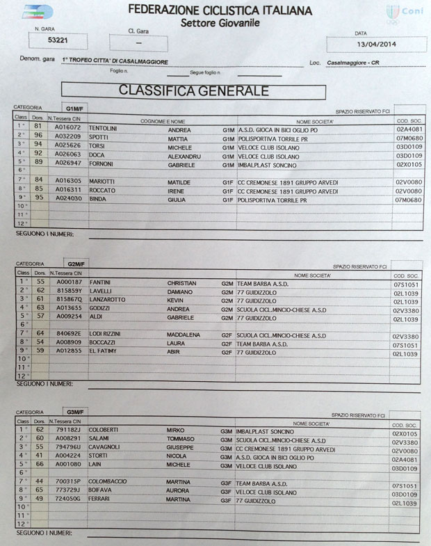 Tanti gli atleti, tanti i genitori e famigliari delle varie società sportive coinvolte nella manifestazione. In tarda mattinata le classifiche sono state tradotte in premiazioni, che hanno riguardato sia maschi che femmine di ogni singola categoria. Prima della consegna dei trofei, il presidente del Consiglio comunale con delega allo Sport, Calogero Tascarella, ha ribadito l’importanza della diffusione della pratica del ciclismo a Casalmaggiore, oltre all’attenzione dell’amministrazione uscente alle nuove generazioni. Maurizio Vezzosi, dirigente e direttore sportivo di Gioca in Bici Oglio Po, si è poi augurato che la manifestazione possa essere solo la prima di una lunga serie di iniziative legate al ciclismo giovanile nel comprensorio: anche Viadana avrà un suo trofeo, tra qualche mese, giusto per sottolineare che la dicitura Oglio Po è presente non a caso nel nome del sodalizio. Dal palco poi sono stati diffusi i ringraziamenti agli sponsor e insieme ai volontari dei vari gruppi che hanno dato una mano all’organizzazione, oltre che ai rappresentanti di Federciclismo e Avis Pedale Casalasco, sono stati premiati i primi cinque classificati di ogni categoria, maschile e femminile, tra gli applausi di genitori e conoscenti. In quattro parole: una festa di sport.