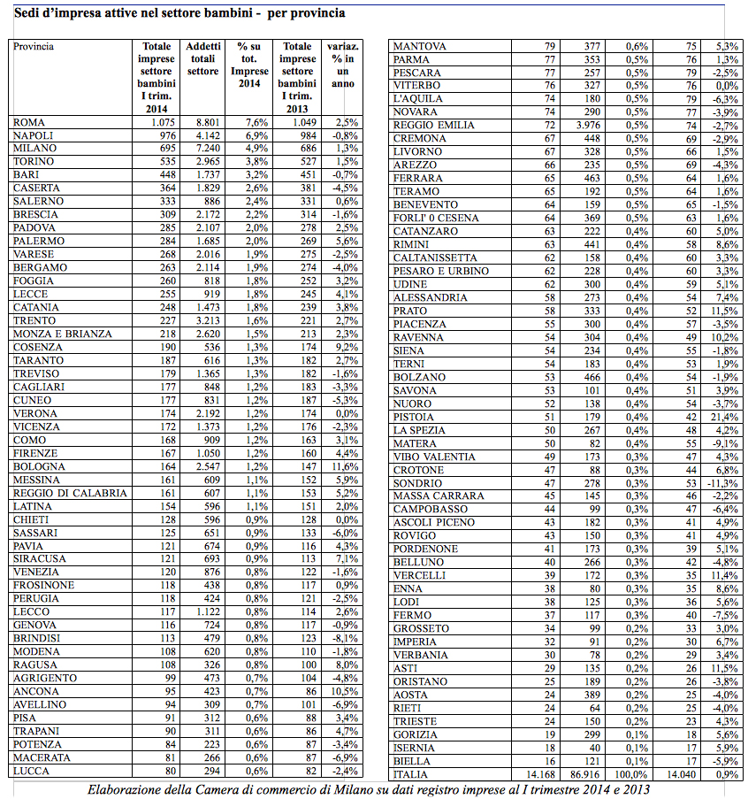 Mentre la gran parte delle province lombarde fa segnare una crescita del numero di imprese del settore dell’infanzia, il territorio cremonese perde terreno anche su questo fronte. Dati poco confortanti quelli che riguardano l’inizio del 2014. I numeri sono quelli del registro imprese (si riferiscono alle attività registrate come sedi d’impresa) e sono stati elaborati dalla Camera di commercio di Milano, che ha realizzato una panoramica del settore. L’analisi riguarda le imprese legate alla produzione di beni e servizi per la prima infanzia e mette a confronto il primo trimestre 2014 con il primo trimestre 2013. In provincia di Cremona (oltre 400 gli addetti in questo settore nel nostro territorio) si evidenzia un calo del 2,9% del numero di imprese nel giro di un anno (nel primo trimestre 2014 67 imprese di questo tipo, tra istruzione prescolastica, servizi di asili nido e assistenza, fabbricazione di carrozzine e passeggini, commercio di confezioni per bambini e neonati). Solo le province di Sondrio (-11,3%) e Bergamo (-4%) fanno peggio in Lombardia. Variazione meno negativa in provincia di Varese (-2,5%) e in provincia di Brescia (-1,6%). Crescita in tutti gli altri territori della regione.