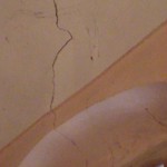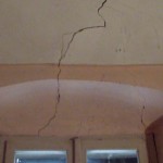 Nella fotogallery, una delle crepe nella volta interna della casa parrocchiale e le condizioni del sottotetto