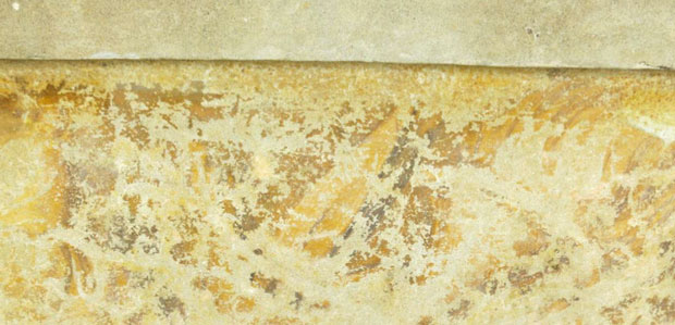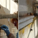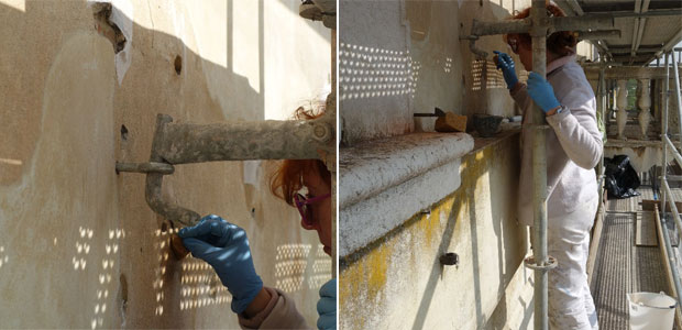 La maggior parte dell’intonaco risale invece a successivi interventi di restauro, ben distinguibili da quelli originali. La porzione più degradata è quella superiore, posta inferiormente ai grandi mensoloni, più esposta alle intemperie che hanno causato vistosi fenomeni di polverizzazione causati dell’aggressione delle acque acide meteoriche. La presenza di lacune e di  fessurazioni ha inoltre  causato vasti fenomeni di distacco dal supporto murario a causa dell’ingresso di acqua e ai conseguenti fenomeni di gelività nei mesi invernali. Le analisi chimiche condotte hanno consentito di definire sia la natura delle malte impiegate che la natura delle alterazione presenti.