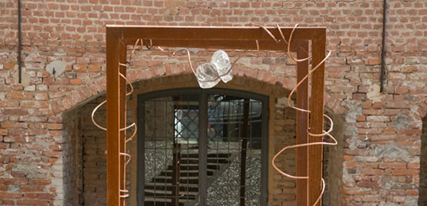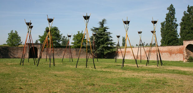 A Sabbioneta le opere di Lanfredini ci offrono una lettura critica degli spazi di Palazzo Giardino, luogo di delizia, dove Vespasiano Gonzaga si appartava nel suo studiolo, riceveva gli amici letterati, ai quali mostrava la collezione d’arte e maraviglie esposta in Galleria, e lo immaginiamo passeggiare nel giardino all’italiana, oggi solo in parte leggibile. E il giardino, col suo spazio rettangolare segnato ai punti cardinali da nicchie che fingono grotte, è la collocazione ideale per la suggestiva installazione dell’opera Nidi. Mentre all’interno del Palazzo il dialogo più prossimo delle opere di Lanfredini è con le pitture antiche e le loro simbologie, con le architetture dipinte e reali dello spazio prospettico della Galleria, segnato dalle colonne della sua Foresta impugnabile. Al termine del viaggio, nella suggestiva piazzetta della chiesa di San Rocco, l’artista ha posto una simbolica Soglia del viandante smarrito, invito a perdersi nell’intrico di strade della città”.