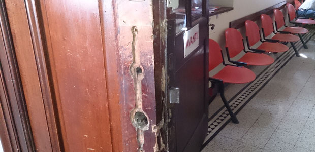 Percorrendo qualche metro, infatti, anche la porta a vetri era spalancata e presentava segni di effrazione, anche se il danno strutturalmente peggiore è quello provocato alla porta d’accesso, al primo piano dunque dopo una rampa di scale, ai veri e propri uffici della Cgil: i ladri, infatti, che hanno sicuramente agito nella notte (“io sono uscita ieri sera alle 20” racconta Claudia Barbieri, sindacalista Cgil da anni), hanno spaccato con il piede di porco la controcartella della serratura della vecchia porta d’accesso in legno, che si trova esattamente di fronte all’ingresso di quello che fu il Circolo Turati. L’immobile, come noto, appartiene alla Casa di Riposo Busi di Casalmaggiore.