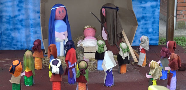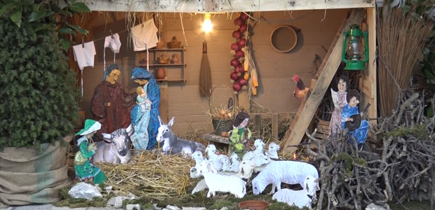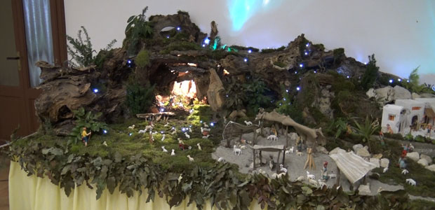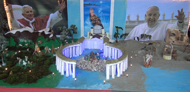 A pochi passi da lì, in corrispondenza della chiesa parrocchiale e della rientranza denominata Grotta di Lourdes è stato ricavato un nuovo spazio, più ristretto ma comunque capace di richiamare mistico raccoglimento, per un’altra Natività celebrata quasi all’ingresso della chiesa stessa. Un presepe che sullo sfondo richiama la figura dei due Papi, Benedetto XVI e Francesco, riprendendo l’architettura del colonnato del Bernini a piazza San Pietro a Roma.