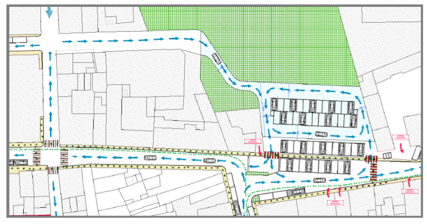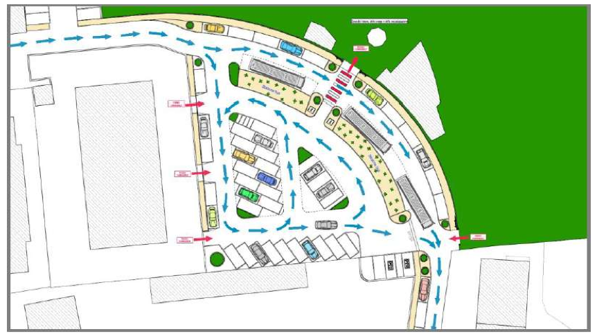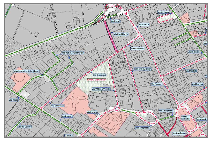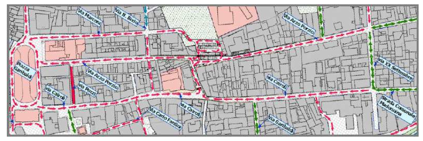 ZONA VIA CAIROLI – VIA COLOMBO – VIA AZZO PORZIO – PIAZZA GARIBALDI – VIA MARCONI – La proposta è quella di portare via Colombo a senso unico con direzione da via Cairoli a via Azzo Porzio, dividere via Cairoli in due tratti, il primo tratto sarà a senso unico da Piazza Garibaldi sino a via Colombo, il secondo tratto invece andrà da via XX Settembre a Via Colombo, in senso contrario al primo. Nel primo tratto di via Cairoli verranno riorganizzati i parcheggi, verrà migliorato l’incrocio con via Saffi tramite la posa di manufatti di delimitazione , al fine di garantire una maggiore sicurezza sia ai pedoni sia alle autovetture parcheggiate. Nel secondo tratto di via Cairoli verranno risistemati i parcheggi, verrà posizionato un restringimento di carreggiata al fine di ridurre la tentazione di eccedere nella velocità e inoltre avremo una maggiore sicurezza dei pedoni e dei ciclisti, considerato inoltre che, esiste per i ciclisti una corsia dedicata. Via Colombo diventerà a senso unico da via Cairoli a via Azzo Porzio, verranno risistemati i parcheggi in tutta la via, verrà riorganizzato l’incrocio con via Azzo Porzio. Via Azzo Porzio sarà divisa in due tratti, il primo tratto sarà senso unico in uscita da Casalmaggiore, ed andrà da via Colombo a Via XX Settembre, invece il secondo tratto sarà senso unico con direzione da via Colombo a Piazza Garibaldi come attualmente. Nel primo tratto saranno riorganizzati i parcheggi, in modo da ridurre la tentazione da parte degli automobilisti di oltrepassare il limite di velocità. Altro provvedimento che ha già fatto e farà discutere, per il necessario abbattimento delle piante che delimitano il parco di via Trento sul lato di via Porzio, al fine di fronteggiare la consistente perdita di parcheggi (così recita il PUT riportato dal VAS) nelle via adiacenti verrà realizzato un piccolo parcheggio utilizzando una parte del attuale parco, pari a circa 700,00 mq.; innanzi tutto il nuovo parcheggio si incorpora con gli attuali posti auto, così facendo si aumenta l’area di parcheggio riducendo al minimo il prelievo di terreno dal parco. Come si evince dall’inserto grafico, un’altra sostanziale opera a corredo del parcheggio in oggetto è il prolungamento di un piccolo tratto di via Marconi, il quale favorirà l’ingresso ai posti auto da chi proviene da via Via Bixio, considerando che il tratto terminale di quest’ultima diventerà a senso unico da via Azzo Porzio. Nel secondo tratto di Via Azzo Porzio verranno riorganizzati i parcheggi, verrà posizionato come in via Cairoli un restringimento di carreggiata. Sarà risistemato l’incrocio fra via Marconi e Via Cavour in entrata a Piazza Garibaldi, ove attualmente sono presenti dei conflitti fra i flussi di traffico della Piazza e quelli in immissione dalle vie in oggetto. Seguirà la riorganizzazione dei parcheggi nella zona dell’attuale edicola. Tale riorganizzazione di fatto allunga virtualmente via Marconi portandola al limite di incrocio con via Cavour; attraverso la costruzione di un’aiuola nel tratto finale (virtuale) di via Marconi si restringe la carreggiata garantendo un incrocio più sicuro per chi vi transita.