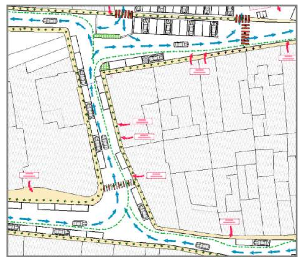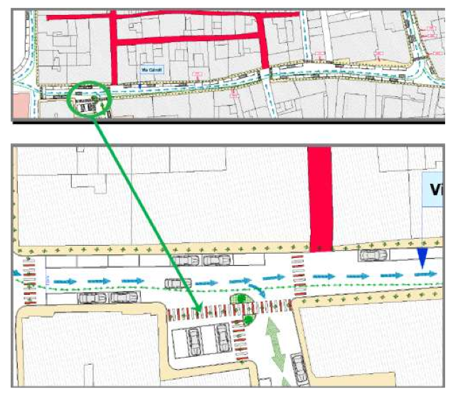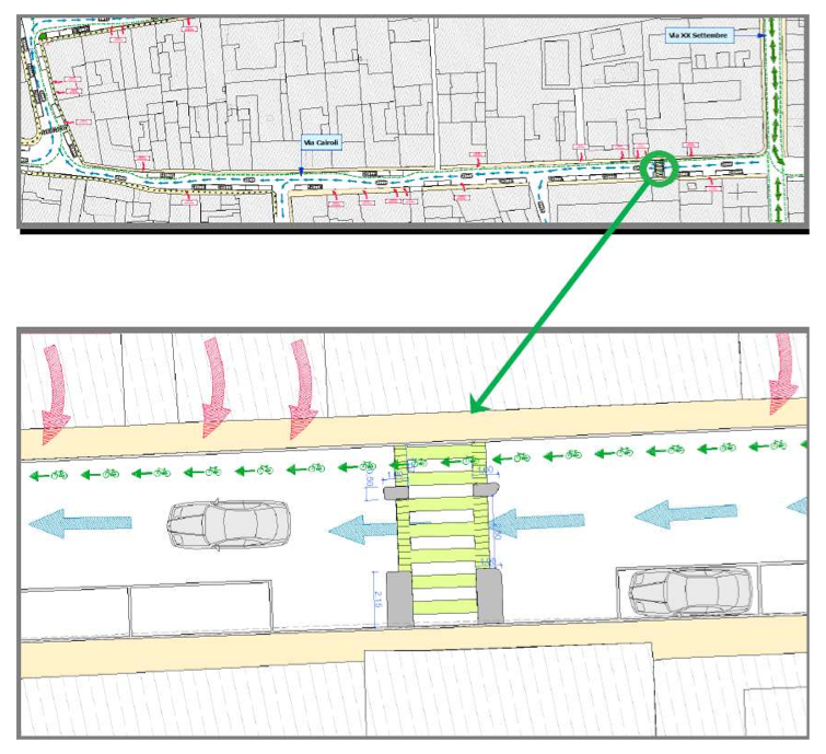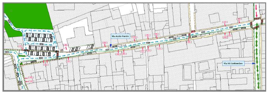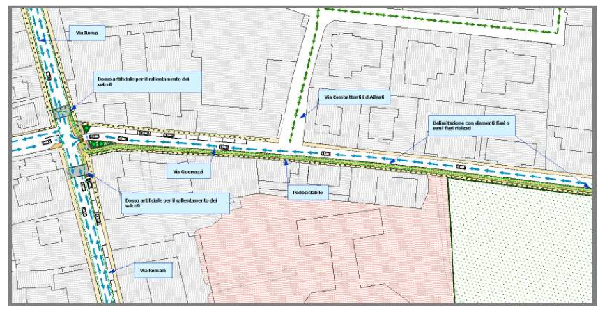 VIA ROMA – VIA ROMANI: Istituzione senso unico di circolazione in via Romani dall’incrocio via Adua – Via Formis a Via Baldesio. Inversione dell’attuale senso unico dell’ultimo tratto finale di via Adua fino all’incrocio con via Romani. Creazione di due dossi artificiali per il rallentamento delle autovetture in prossimità dell’incrocio con via Guerrazzi e via Del Lavoro. Allargamento delle sezioni terminali dei marciapiedi, sistemazione di stalli per le autovetture, secondo la normativa vigente, lasciando libero il passaggio pedonale sui marciapiedi attualmente occupati.