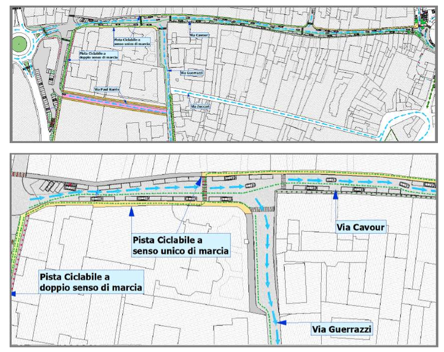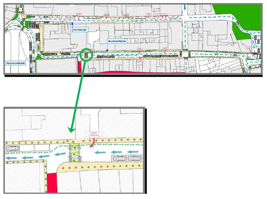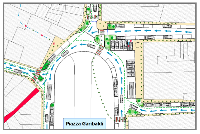 ZONA VIA CAVOUR – Gli interventi: sarà risistemato il parcheggio nella zona finale di via Petofi e via Paul Harris, Collegamento di via Paul Harris a via Petofi. Primo tratto di via Cavour da via Petofi a via Guerrazzi diventerà senso unico in direzione della piazza Garibaldi. Saranno risistemati i parcheggi in tutta la via facendo in modo che ci sia un rallentamento delle autovetture. Sarà creata una pista ciclabile ad uso promiscuo allargando la sezione del marciapiede esistente, dalla piazza sino all’ attuale stazione dei carabinieri, dove verrà realizzato un attraversamento pedonale e si utilizzerà il marciapiede dal lato opposto della carreggiata, che è di dimensioni adeguate per contenere la ciclabile ad uso promiscuo che proseguirà sino a via Petofi. Saranno create delle aiuole per facilitare e risolvere l’incrocio via Cavour, via Marconi, Piazza Garibaldi, facendo in modo che le vetture si incanalino senza creare momenti d’intralcio fra le due vie, che devono immettersi entrambe in Piazza Garibaldi e le autovetture già immesse nella Piazza stessa.