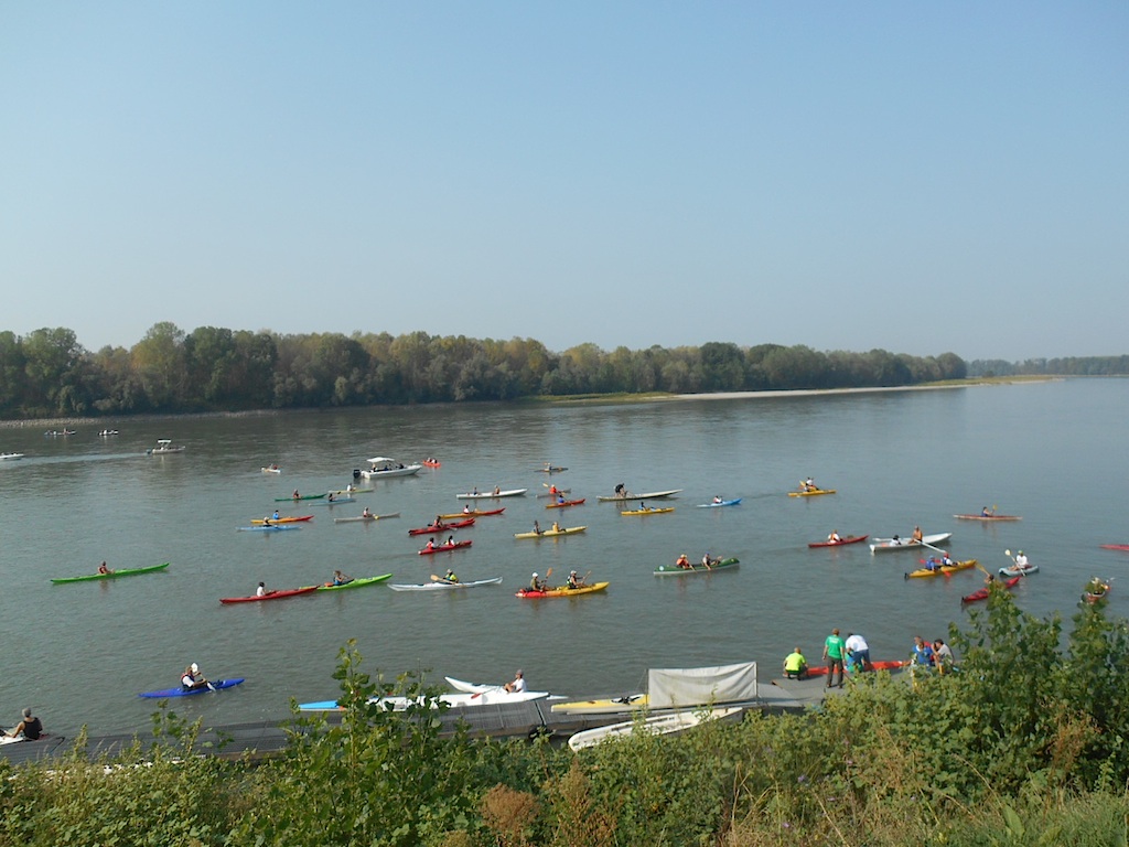 Numeri straordinari, quelli di quest’anno, per la discesa del Po. “La più numerosa che io ricordi, l’edizione da record” sottolinea Arcangelo Pirovano, ex presidente della Federazione Italiana Canoa Turistica. E lui le ha fatte tutte. Non solo il canoa pure ma in bici a partecipare questa mattina alla sesta discesa del Po. Le prime barche, in solitaria, sono partite verso le 9.30 seguite poi dal gruppo compatto, dalle motonavi, partito poco dopo le 10, insieme al gruppo di ciclisti da Casalmaggiore. Ma i ciclisti più mattinieri erano partiti alle 8 di questa mattina da Polesine Parmense. Un bel viaggio, sia in barca che in fiume, considerando il caldo.