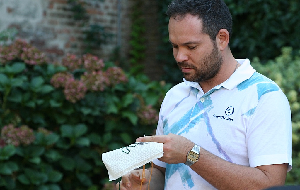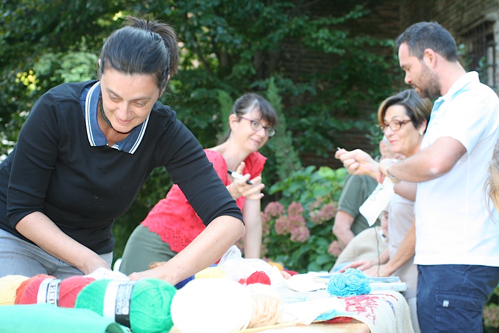 CASALMAGGIORE – Il filos. Come quelli di una volta. E poco importa che non si fosse in un’aia di qualche antico cascinale perché il contesto, il giardino della fioreria Sartori in via Vaghi, appoggiato all’antico Torrione Gonzaghesco, è comunque uno degli angoli più suggestivi della città. All’interno di Casalmaggiore Contemporanea e della retrospettiva dedicata a Giuseppe Raineri si è tenuta questo pomeriggio, a partire dalle 16.30, un’esperienza ‘materica’ legata alla socializzazione. “Abbiamo utilizzato – spiega Massimiliano Valenti, uno dei curatori della mostra dedicata a Giuseppone – la lana e la tela, materiali caldi. Inizialmente c’era un po’ di silenzio, poi le persone coinvolte hanno cominciato a parlare tra loro mentre lavoravano. E’ il recupero della socialità un momento importante”. Una tela grande da ricamare, ed altre più piccole. L’esperienza ha visto coinvolti un gruppo di anziani ospiti della Casa di Riposo Busi di Casalmaggiore. Dopo un certo imbarazzo iniziale, le mani hanno cominciato a disegnare trame. Al gruppo di anziani si è aggiunto un gruppo di donne e il gruppo ha proseguito nel lavoro. A condurre l’esperienza emozionale l’artista fiorentina Beatrice Bartolozzi. Un’esperienza interessante, accompagnata anche dal suono dell’organetto che ha positivamente coinvolto gli ospiti della casa di riposo e le persone – non tante, purtroppo – che han deciso di passare un’ora diversa dal solito. Con semplicità, senza telefoni e rumori, lasciando andare le mani e la favella, alleggerendo il cuore.