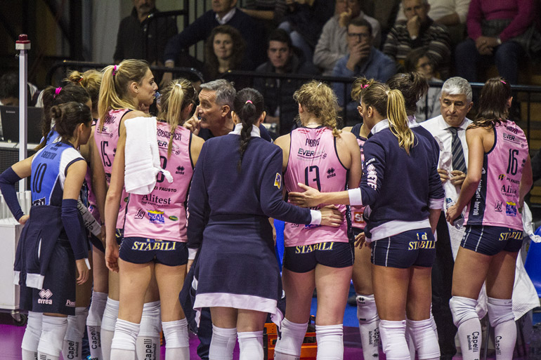 Davide Mazzanti, coach dell’Imoco Conegliano:” E’ stata una partita bellissima, perchè i primi due set la Pomì ha fatto valere la loro organizzazione muro/difesa ed è stato davvero difficile metterla a terra, poi un po’ noi abbiamo cambiato assetto, un po’ loro sono calate e così siamo riusciti a saltare fuori. Nel quarto Fabris ha girato il set con quel giro di battute e da lì siamo state un pochino meno aggressive così la Pomì è uscita da quella situazione. Una splendida partita punto a punto che ci servirà per lavorare in questa direzione perchè credo sia stata la nostra più bella partita finora”.