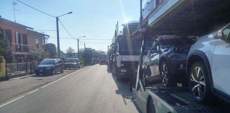 La scena, in effetti, è abbastanza impressionante: immaginatevi 23 camion bisarca che trasportano auto nuove di zecca (tutti con targhe diverse, per lo più lituane o tedesche) incolonnati uno dietro l’altro lungo una via che non ha certo una carreggiata percorribile molto ampia, in qualche caso con sosta su entrambi i lati. FOTOGALLERY