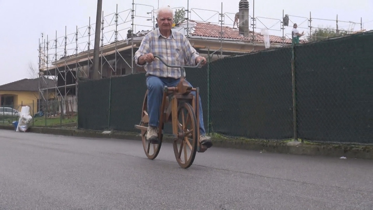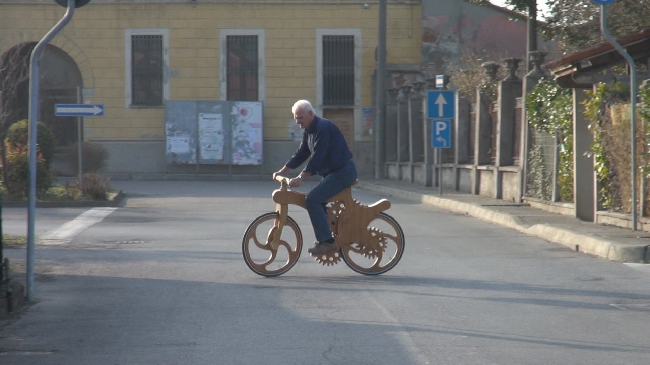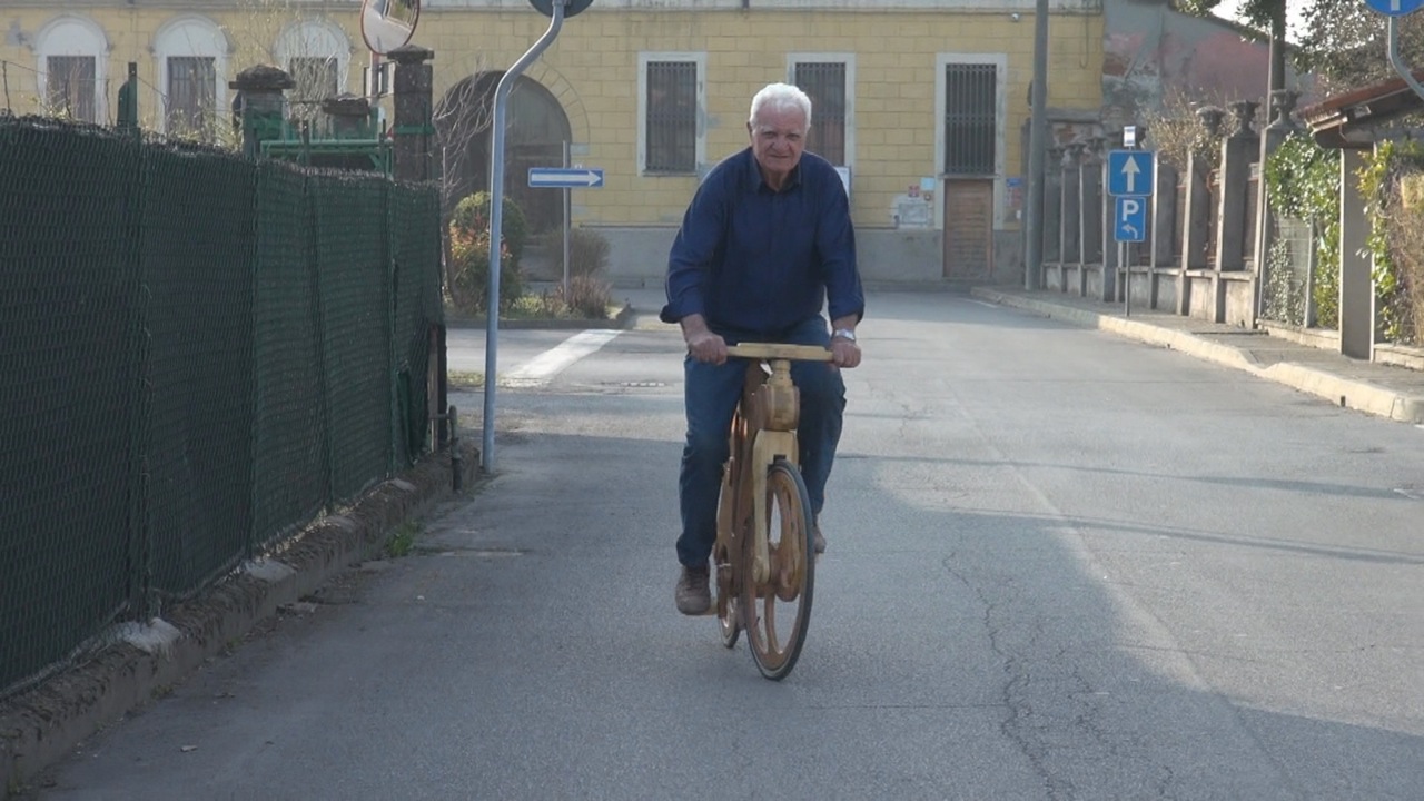 MOTTA BALUFFI – Dieci anni fa la prima impresa: una scommessa tra amici, vinta da un falegname in pensione che nel suo laboratorio di Motta Baluffi realizza biciclette di legno per passione. Romano Meloni, artigiano classe 1938, nell’ultimo decennio ha reso arte quella che fu la sua professione sin da piccolo. Provando anche ad ereditare il genio assoluto di Leonardo, dando vita alla bicicletta ideata dall’inventore vinciano. Un’opera unica nel suo genere, custodita gelosamente nella teca – artigianale anche quella – ricavata al secondo piano della falegnameria di via San Rocco, a due passi, anzi due pedalate dal centro cittadino di Motta Baluffi. Pedalate che negli ultimi anni attirano sempre l’attenzione, perché quando Meloni esce dal cancello inforcando una sua creazione, beh, si stupiscono tutti… Piccoli e grandi non fa differenza, chi lo incrocia per strada si ferma ad osservarlo mentre dà movimento ai suoi velocipedi così strani, così complessi, usciti da un passato enciclopedico e divenuti attuali grazie alla passione di un pensionato.