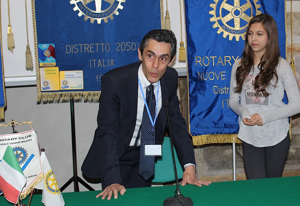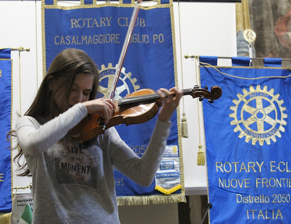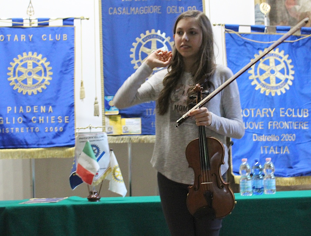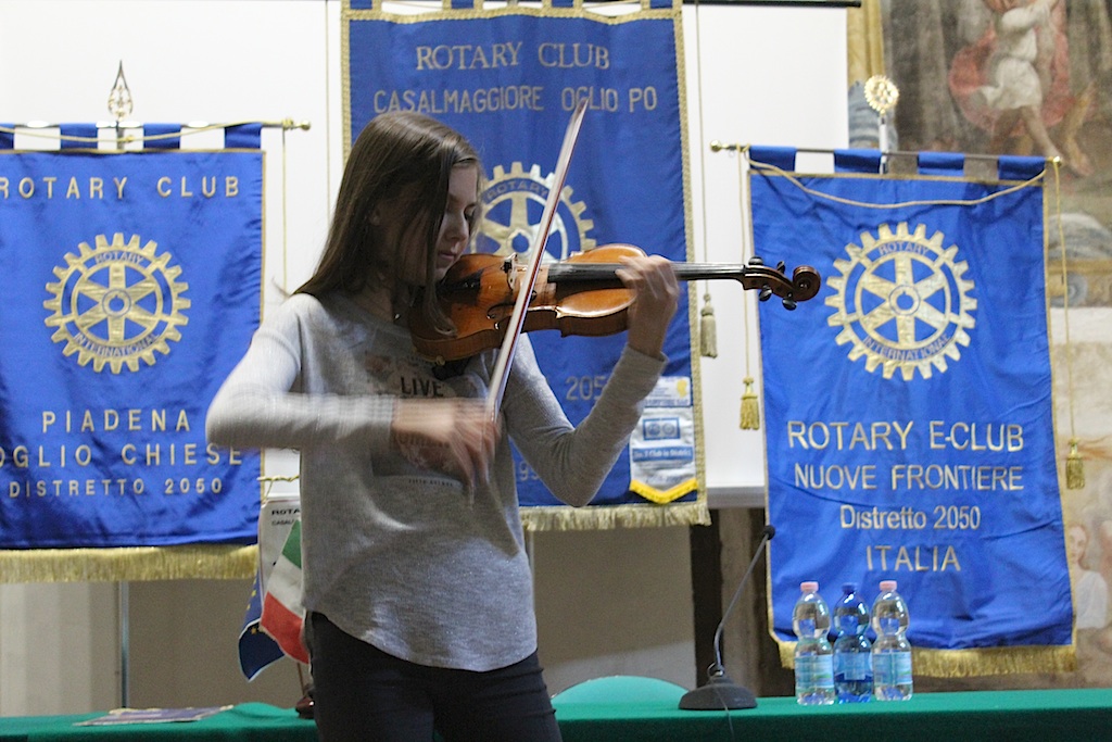 CASALMAGGIORE – Una vera e propria ‘lectio magistralis’, quella che ha aperto ieri il Ryla Junior (iniziativa dei Rotary dedicata ai ragazzi dai 16 ai 18 anni) a Santa Chiara. Una lezione che ha dato l’esempio concreto di come la tenacia, la passione, lo studio e la metodica possano portare ad eccellenti risultati. Ancor più comprensibile ed utile per i ragazzi, poiché tenuta con la semplicità e la freschezza di una ragazza di 15 anni, Clarissa Bevilacqua, ‘enfant prodige’ del violino. A portarla a Casalmaggiore per il primo dei 4 giorni ‘full immersion’ Marzio Somenzi, prossimo presidente del Rotary COP, che l’aveva conosciuta a Cremona dove Clarissa lavora ed ha modo di suonare i migliori violini al mondo per la gioia degli appassionati al museo del Violino.