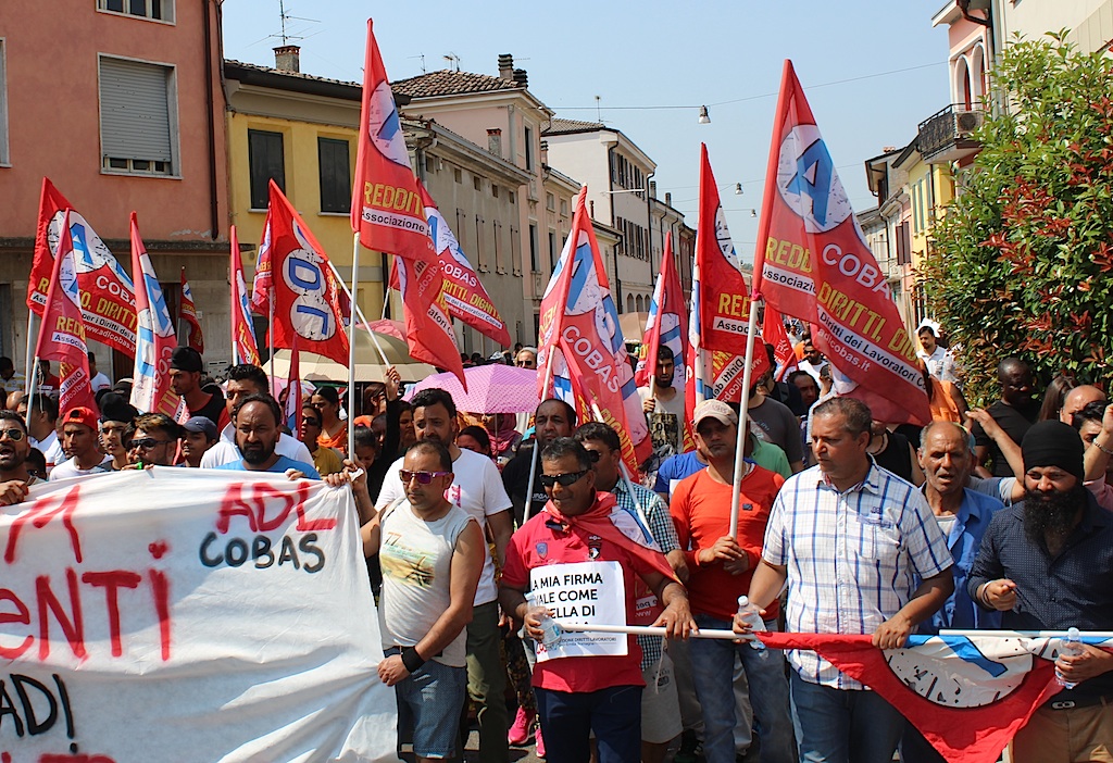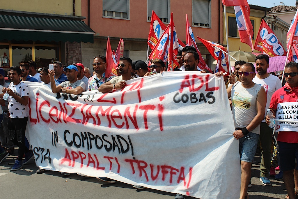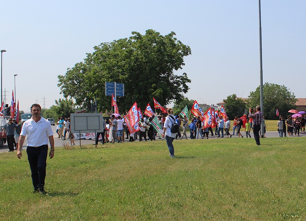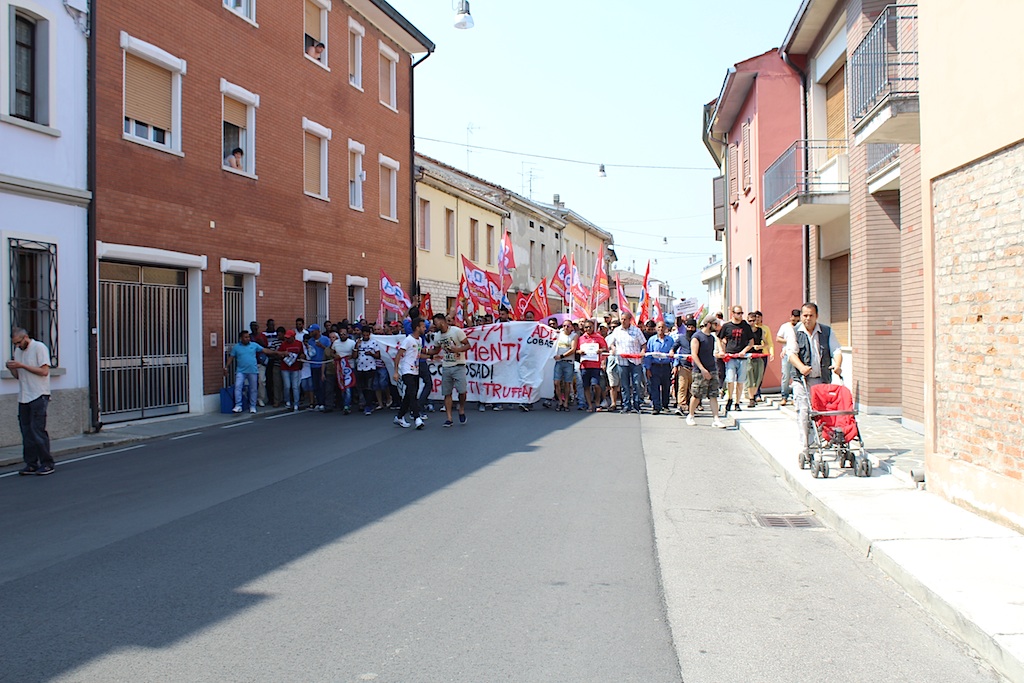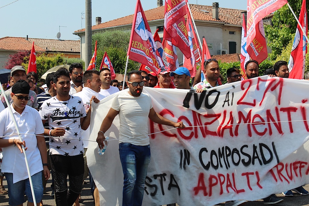 VIADANA – Il corteo, sotto il sole con 35 gradi di caldo, era iniziato con la consegna di una fotocopia contenente la denuncia indirizzata al Tribunale di Mantova, Procura, Finanza, al Ministero dello Sviluppo economico e altri organi coinvolti per sottolineare la pesantissima situazione economico finanziaria della Facchini Viadana. Con comportamenti omissivi dell’organo di controllo e di revisione che ha accettato in modo palesemente ancillare l’operato dell’Amministratore e dell’organo di vigilanza (così è scritto nella denuncia), auspicando a questo punto la nomina di un ispettore o commissario ministeriale ad hoc. Oltre alla pesantissima denuncia tutta la mattinata è trascorsa al grido degli slogan urlati (anche dai bambini appresso alle famiglie) al megafono con “Tocchi uno, tocchi tutti, ladri ladri, restituiteci i nostri diritti, ricordando di avere lasciato nelle casse dell’azienda in dieci anni più di 4 mila euro a testa attraverso rinunce e sacrifici. L’associazione di Mantova Equal attraverso il rappresentante Mario Rossi ha auspicato di mettere in campo addirittura l’esproprio dell’azienda per dare l’impianto ad una cooperativa di lavoratori. A parte i due momenti più critici (alla partenza quando si era manifestata l’intenzione di sfondare lo sbarramento della Polizia con le donne e i bambini ) e all’arrivo davanti ai cancelli sbarrati della Composad, per il resto la manifestazione non ha registrato incidenti. Anche le Forze dell’Ordine, c’erano anche i Carabinieri e la Polizia locale oltre alla celere, hanno tenuto un comportamento di tolleranza nei confronti del blocco stradale effettuato, per pochi minuti, all’altezza della rotonda della Gerbolina, con molti mezzi in coda verso mezzogiorno. Poi tutto si è concluso con l’offerta di riso e lenticchie offerto dal popolo indiano che durante il corteo aveva pure distribuito centinaia di bottiglie di acqua fresca. Alla fine del corteo Stefano Re dei Cobas ha annunciato di aver ricevuto un messaggio da Lega Coop per una convocazione urgente nel primo pomeriggio nella sede di Mantova.