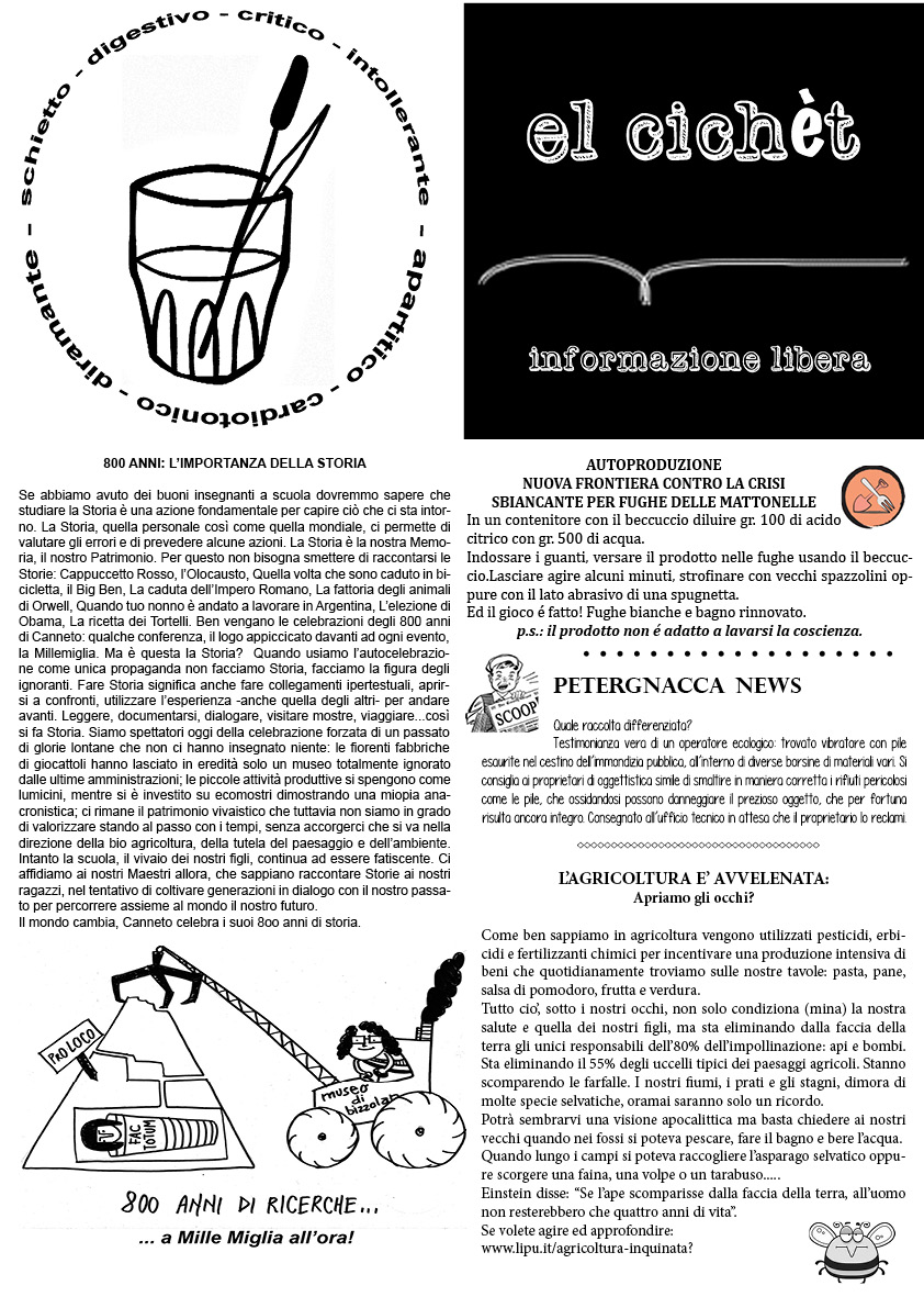 Due pagine in cui pezzi di critica, in chiave ironica, all'amministrazione comunale, si mescolano a ricette tradizionali, consigli per la lettura e poesie. E' l'iniziativa di un gruppo di cannetesi che ha interpretato così le due valenze del termine dialettale "cichèt": quella del rimprovero e quella del "cicchetto", bicchierino di liquore che rinfranca.
