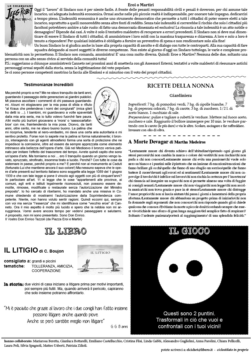 Ma anche temi leggeri, ironici, quasi da “lunario”, mescolati ad appelli ambientalisti e perle letterarie. Per il primo numero, “el cichèt” propone infatti un consiglio per la lettura (“Il Litigio” di C. Boujon), una ricetta della nonna (La Giardiniera), lo spazio per la poesia/prosa “L’ode alla vita” della brasiliana Martha Medeiros :“A Morte Devagar” – tradotto: “Lentamente muore”) e un articolo sull’inquinamento. L’iniziativa, che sicuramente non mancherà di far discutere, nasce da un gruppo di cannetesi deciso a portare il dibattito politico e sociale cannetese anche al di fuori del consiglio comunale in un momento delicato per gli equilibri all’interno della maggioranza che governa Canneto. Al primo “el cichèt” hanno collaborato: Anna Parolini, Maria Rosa Beretta, Gianluca Bottarelli (che è anche capogruppo della minoranza in consiglio), Emiliano Castellucchio, Cristina Flisi, Linda Gabbi, Alessandro Guglielmi, Chiara Pellicelli, Laura Poli, Silvia Spagnoli, Matteo Usberti e Patrizia Zilioli. Chi vuole comunicare con loro, in attesa di capire quando uscirà il prossimo numero, può farlo scrivendo a:  elcichet@libero.it .