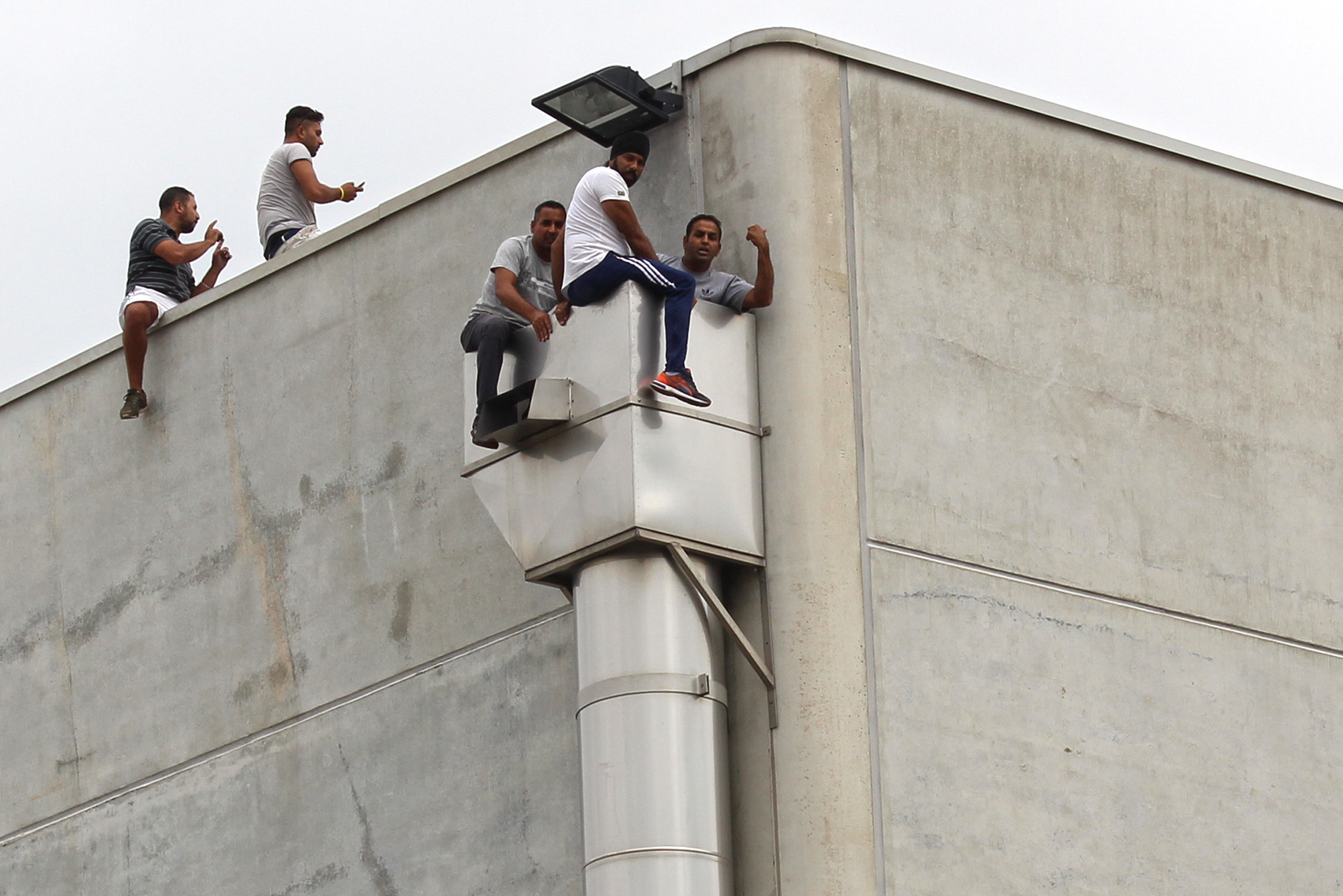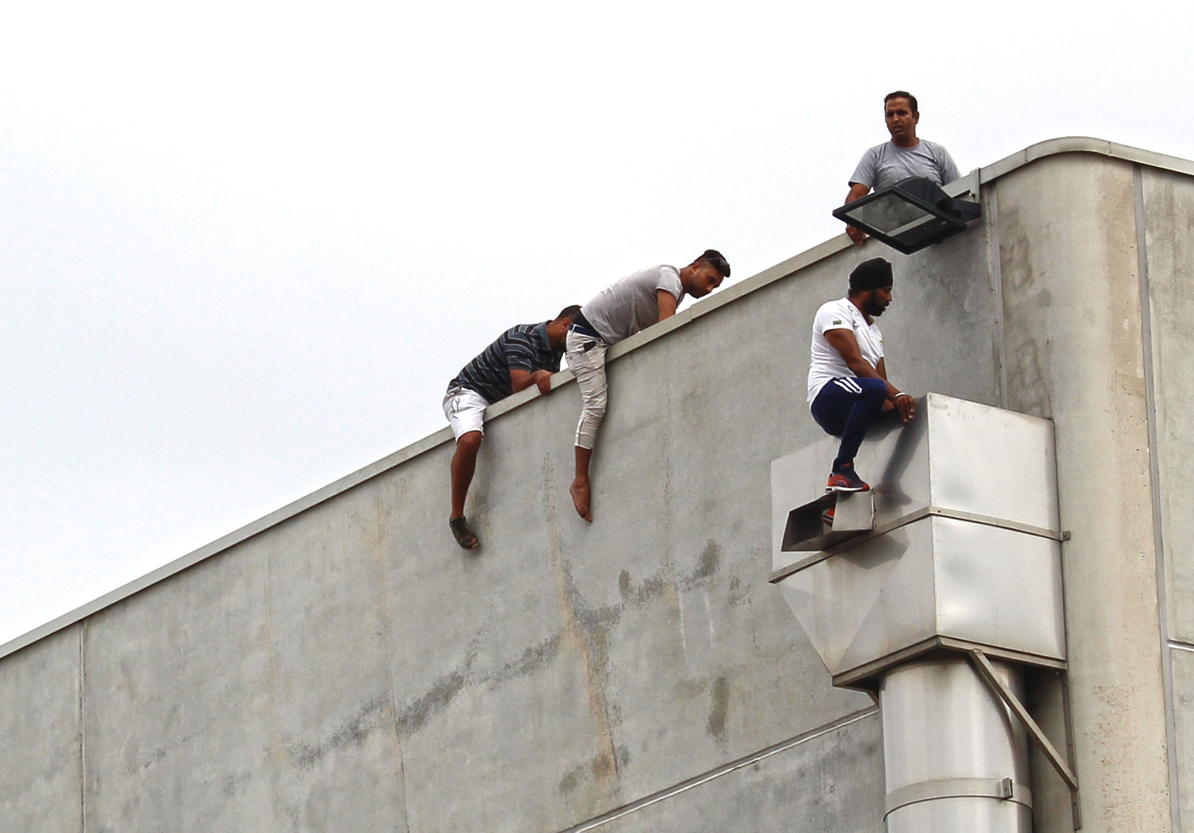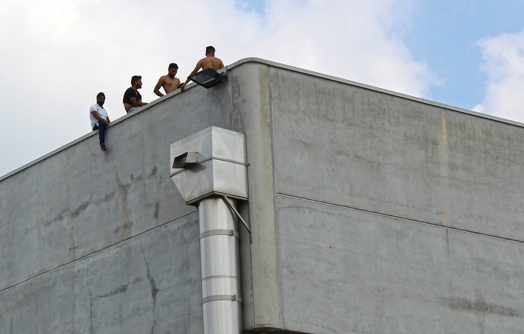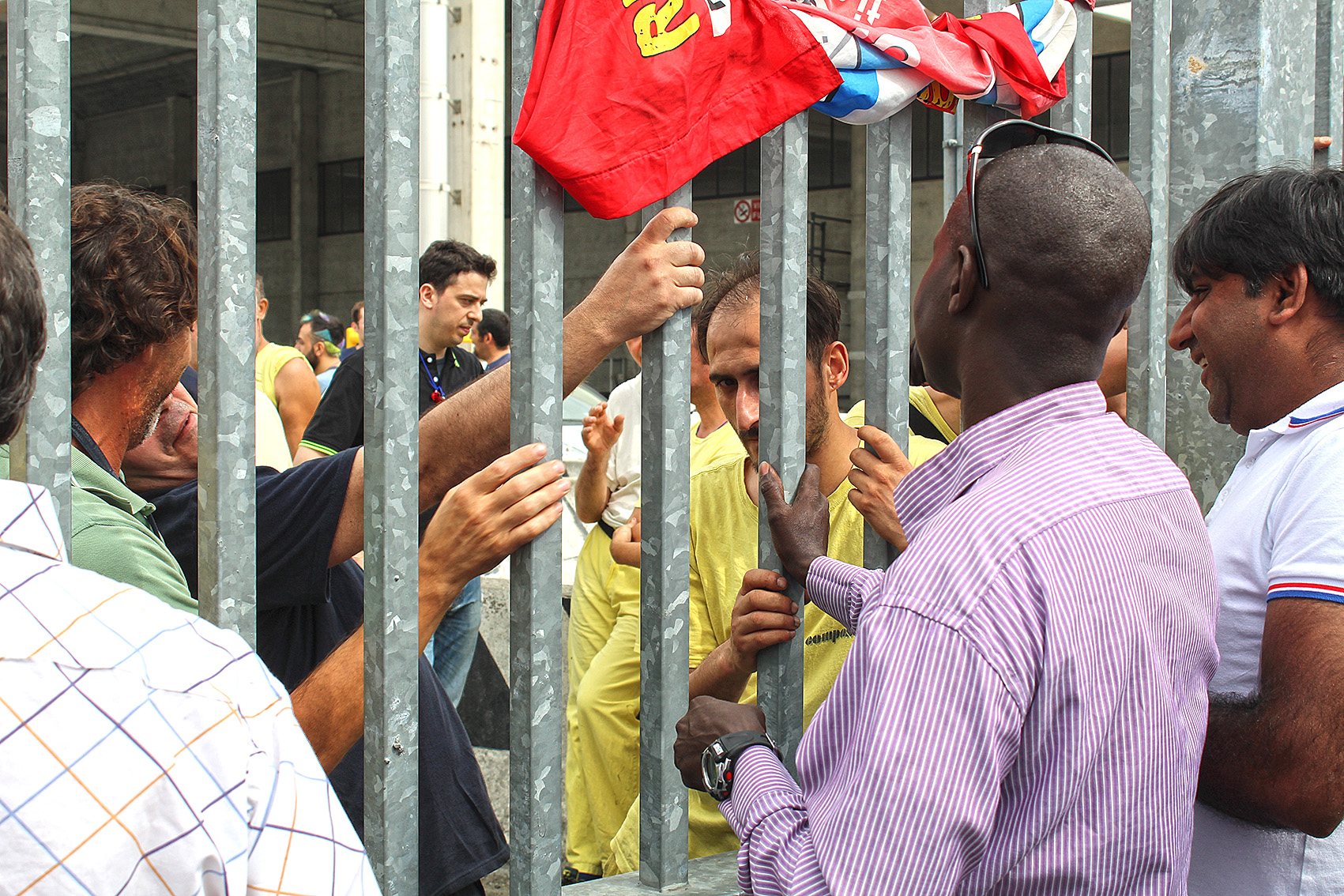 AGGIORNAMENTO ORE 13.50 – Acqua tirata su con una corda ed un uncino, ma la situazione rischia di trascinarsi a lungo. Difficile capire quanti siano. Dieci, quindici persone pronte a gesti estremi se qualcuno tenterà di avvicinarsi. E l’incidente serio lo si è rischiato davvero questa mattina poco dopo le 11 quando, per motivi in corso d’accertamento, qualcuno si è portato sul tetto. Alla vista dell’estraneo tre ex operai facchini (come si vede nella fotogallery) si sono calati nel tubo ancorato alla struttura, minacciando di lasciarsi cadere. L’atmosfera, sino ad allora accettabile, si è fatta infuocata. Gli altri operai giù hanno forzato il cancello, qualcuno urlava che se fosse morto qualcuno di loro, avrebbe dato fuoco alla fabbrica. Altissima tensione sino a quando anche grazie ai carabinieri (che non ne sapevano nulla dell’uomo sul tetto) si è riportata la calma. Gli operai non scenderanno sino a che non verrà loro data la mensilità sospesa e trovata una soluzione per tutti. I carabinieri stanno vegliando sul luogo insieme alla questura. La situazione è di calma apparente ma basta poco per tornare a respirare l’alta tensione. Prerogativa fondamentale adesso è quella di evitare incidenti.