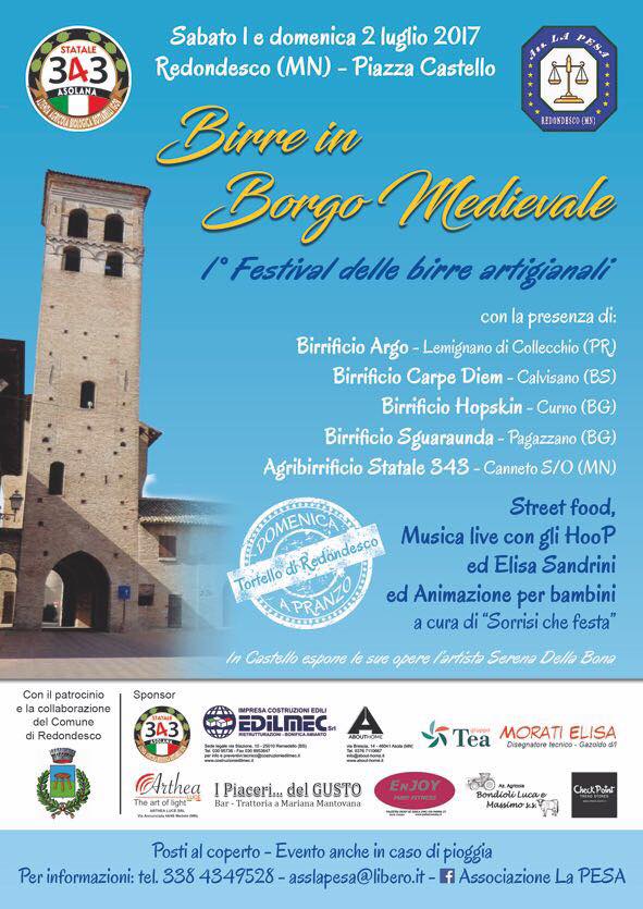 REDONDESCO – Appuntamento da non perdere per gli amanti della birra, della buona tavola e del divertimento, sabato e domenica a Redondesco. In Piazza Castello andrà in scena “Birre in Borgo Medievale”, il Primo Festivale delle birre artigianali organizzato dall’agribirrificio Statale 343 di Canneto, con l’Associazione La Pesa di Redondesco, la collaborazione e il patrocinio del Comune nonché il supporto di diversi sponsor. Oltre alla possibilità di degustare birre prodotte artigianalmente da birrifici provenienti da quattro diverse province, sarà possibile assaggiare street food e i tortelli di Redondesco (questi ultimi domenica a pranzo), ascoltare musica e intrattenere i bambini con un apposito servizio di animazione. Sono previsti posti al coperto, per cui la manifestazione si terrà anche in caso di pioggia.