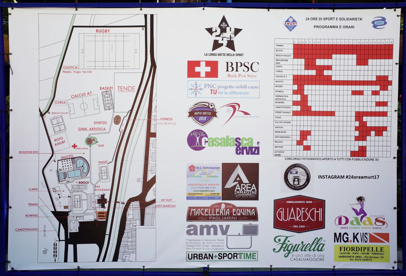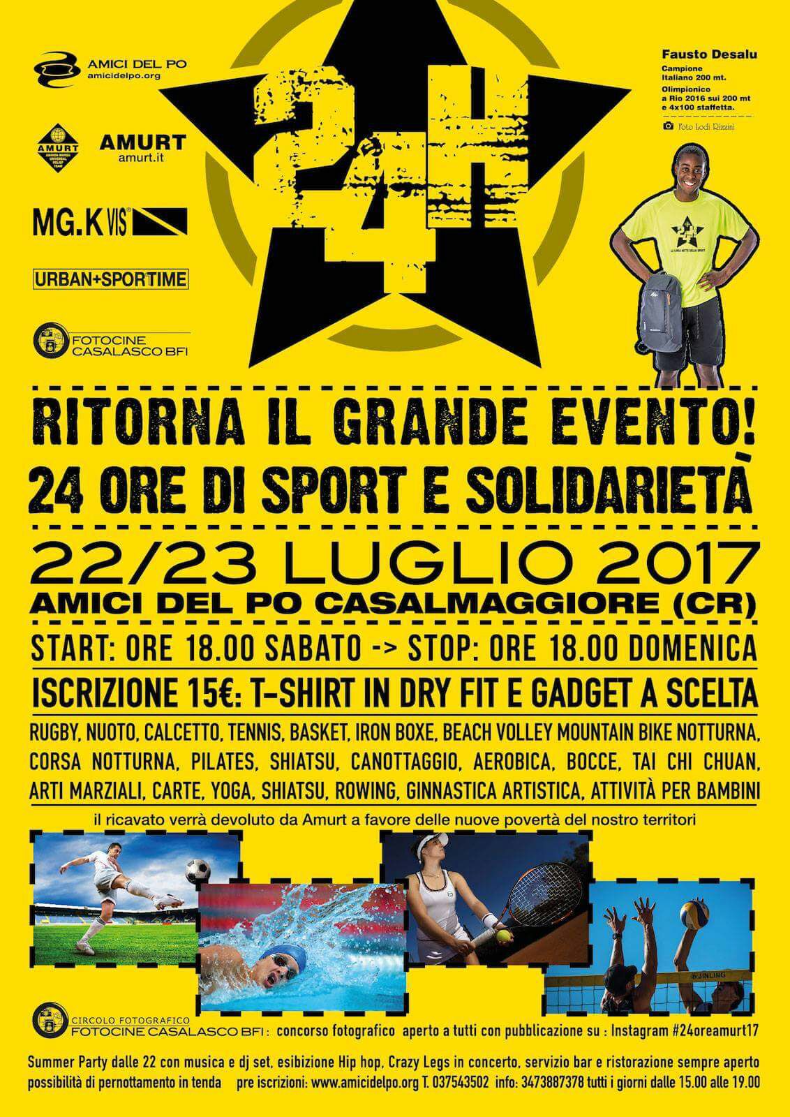 Per quanto riguarda gli sport gli iscritti si potranno cimentare nel rugby, nuoto, calcetto, tennis, basket, iron boxe, beach volley, mountain bike notturna, corsa notturna, pilates, Shiatsu, canottaggio, aerobica, bocce, Tai Chi Chuan, arti marziali, carte, Yoga, rowing, ginnastica artistica. Testimonial d’eccezione della 24 ore sarà l’olimpionico casalasco Fausto Desalu.