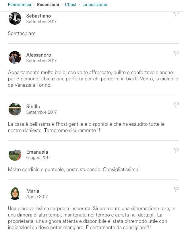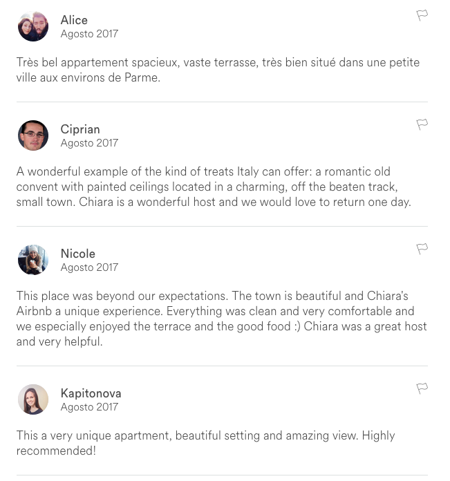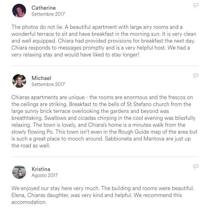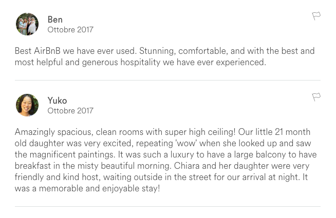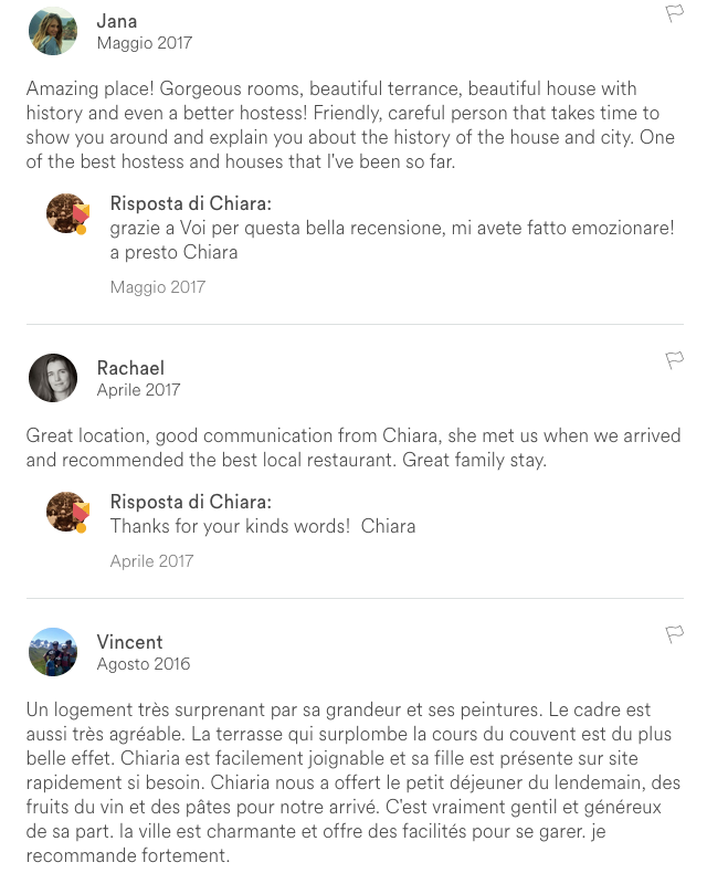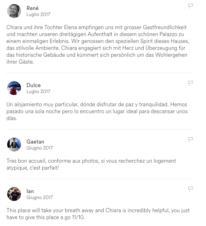 Tornano i cinesi, i tedeschi, gli olandesi, tornano gli altri ospiti, in buona parte stranieri e a loro se ne aggiungono nuovi. Grazie ai feedback positivi e grazie proprio alla posizione strategica della struttura. Per gli stranieri, soggiornare in un luogo storico è la ‘ciliegina sulla torta’ di un viaggio in Italia. Nei loro messaggi, francese, tedesco, inglese, è proprio la storicità del luogo la cosa più apprezzata. Ma non mancano i riconoscimenti ad una piccola città (di cui ci si ricorda solo in tempo di elezioni) appoggiata al fiume.