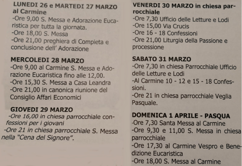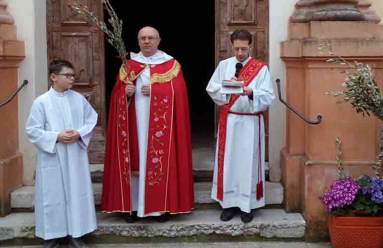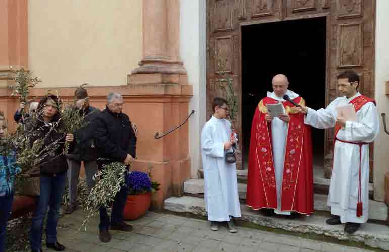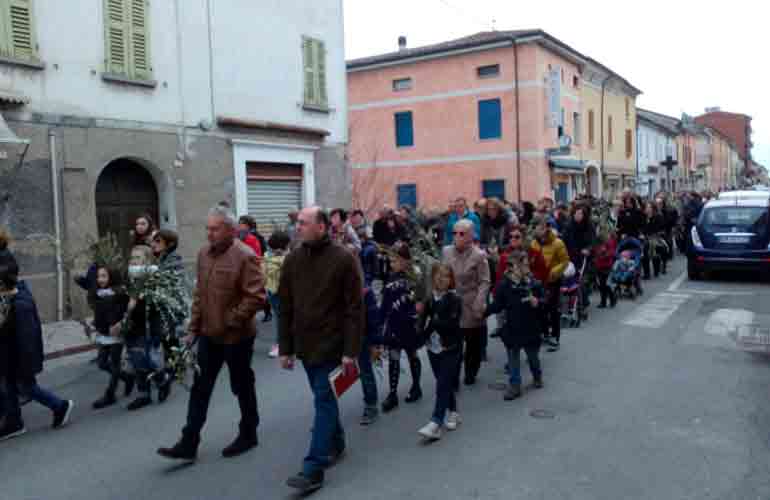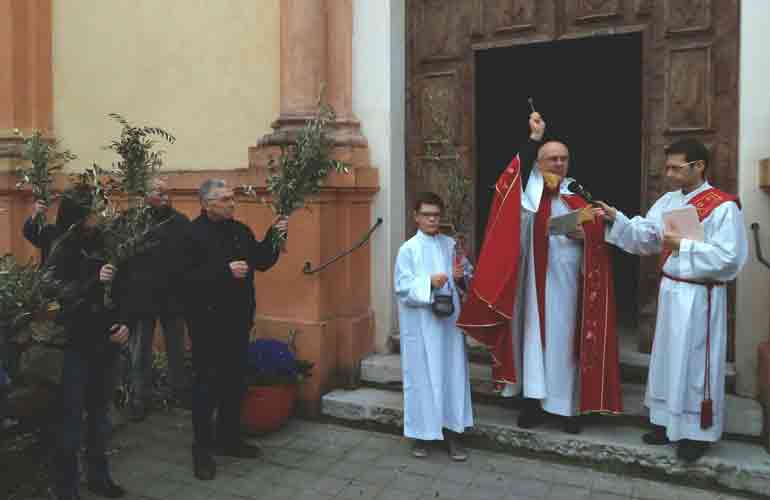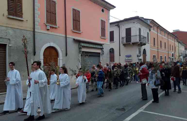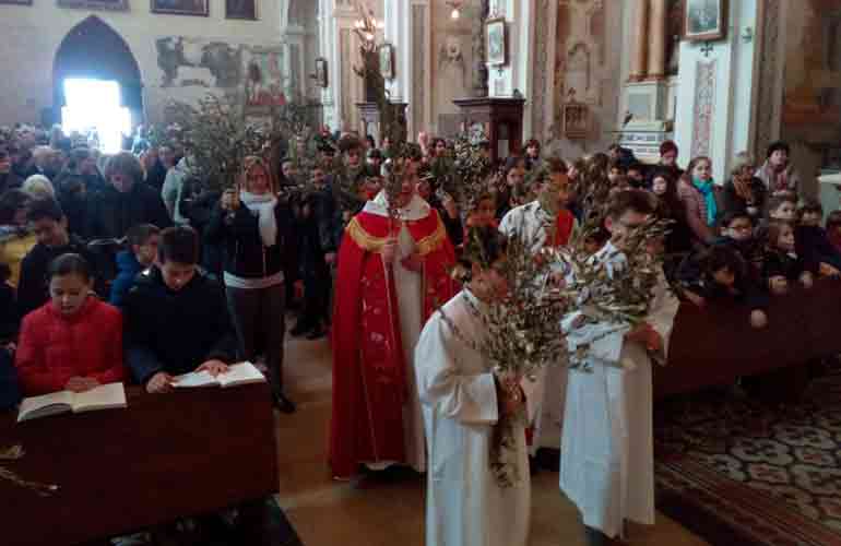 Folta partecipazione alla messa solenne di questa mattina preceduta dalla benedizione dell'Ulivo e dalla processione. Molti anche i ragazzi e i bimbi. Giovedì, venerdì sabato alle 21 il triduo pasquale.