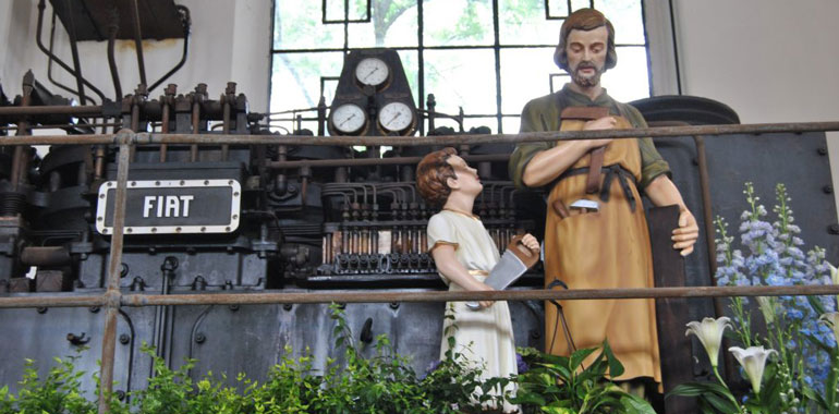 SAN MATTEO DELLE CHIAVICHE (VIADANA) – Un ruvido tavolo da falegname per altare, l’immagine di San Giuseppe e del Figlio Gesù collocati su uno dei quattro enormi motori che fornivano energia elettrica agli impianti che nei decenni hanno governato le acque e garantito prosperità: una location davvero suggestiva per la Messa presieduta dal vescovo di Cremona Antonio Napolioni a San Matteo delle Chiaviche, martedì 1° maggio, memoria di San Giuseppe lavoratore, festa dei lavoratori.