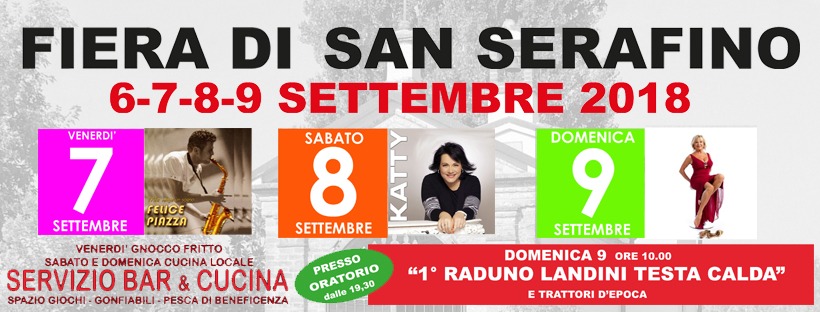 MARTIGNANA PO – Torna la Fiera di San Serafino dal 6 al 9 settembre 2018 presso i locali dell’oratorio. Si parte giovedì sera alle ore 21 presso il Teatro parrocchiale una ricchissima tombola. Seguiranno poi 3 serate di liscio. Venerdì 7 Felice Piazza, Sabato 8 Katty Piva, Domenica 9 Titti Bianchi. In queste sere sarà attivo anche servizio Bar e Cucina con ottimi piatti della cucina locale, venerdì serata torta fritta.