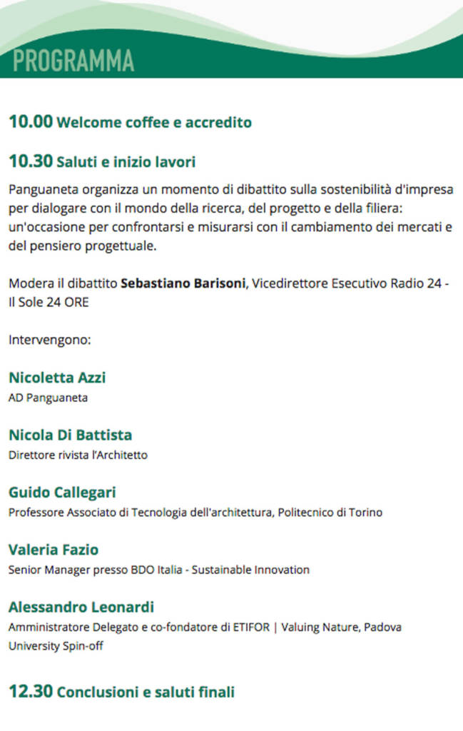 “Abbiamo voluto questo momento di dibattito con la finalità di riflettere sul significato della sostenibilità per un’impresa oggi, mettendo in dialogo il mondo della ricerca, del progetto e della filiera – afferma Nicoletta Azzi, AD Panguaneta. Il nostro obiettivo è proseguire il nostro percorso di crescita e creare un’opportunità di confronto per misurarci con il cambiamento dei mercati e del pensiero progettuale. Abbiamo voluto ampliare lo sguardo della nostra esperienza per capire come le aziende stiano affrontando la sfida di una produzione sostenibile e quali siano gli investimenti da affrontare in termini di innovazione e ricerca. Sarà anche un’occasione importante nella quale raccontare il nostro percorso e gli investimenti che abbiamo in programma, con le importanti ricadute a livello locale in termini di sviluppo, valorizzazione dell’ambiente e occupazione”.