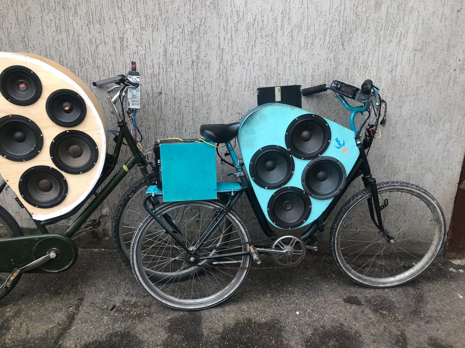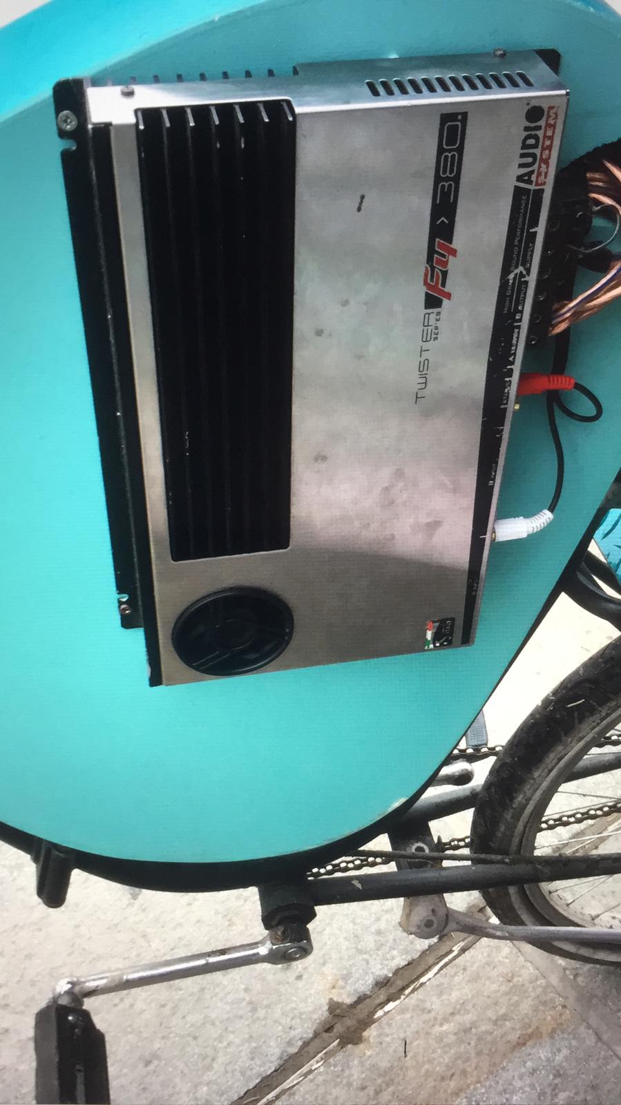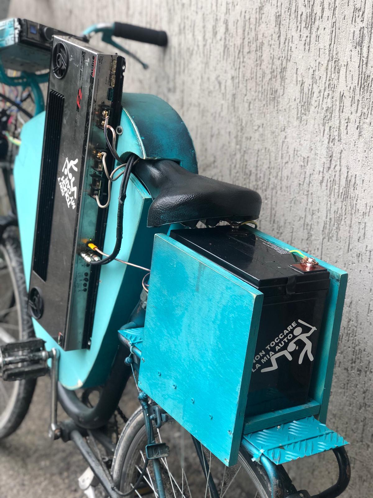 Infatti, tre giorni dopo, progetto, prototipo e scheda tecnica, che qui riporto, erano già pronti: Assicelle di legno tagliate su misura per contenere batteria e casse, Batteria a gel 65 ampere – Amplificatore F4 380 audio system – 4 casse Faital Pro da 260 watt l’una – Autoradio Alpine dotato di AUX / USB / Bluetooth / carica smartphone – Bici da donna.