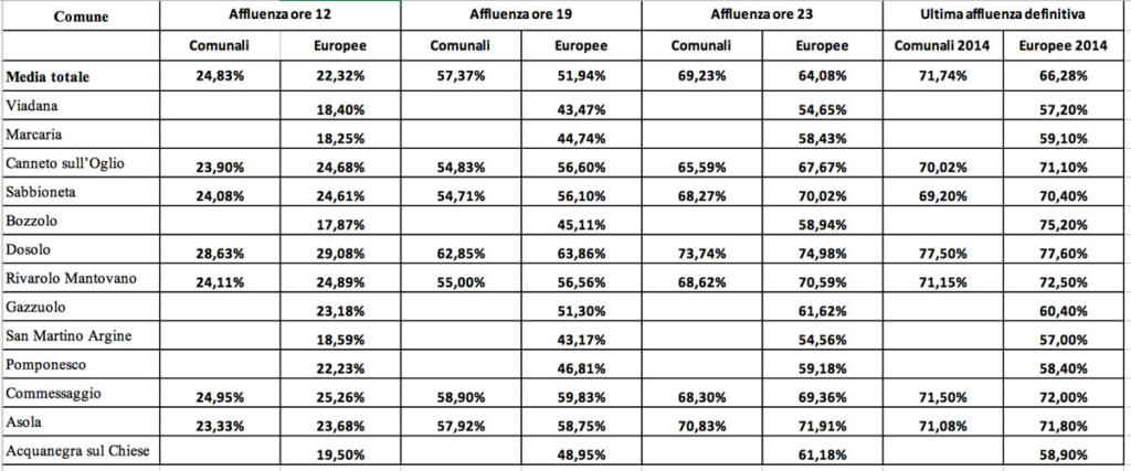 Nei comuni mantovani, invece, il picco è a Dosolo con il 73,74%, seguito da Asola, unico altro comune dei sei al voto per il sindaco e il consiglio comunale a superare il 70%. Ma in media l’affluenza è simile a quella dei comuni Casalaschi e si attesta al 69% (fu quasi del 72% nelle precedenti elezioni). Nel mantovano, a differenza del Casalasco, non ci sono “flop”: i dati più bassi si registrano a Viadana e San Martino dall’Argine, dove si votava solo per le Europee e dove ha votato rispettivamente il 54,65% e il 54,56%. In nessuno dei comuni mantovani al voto per il Comune il dato dell’affluenza ha superato quello del 2014.