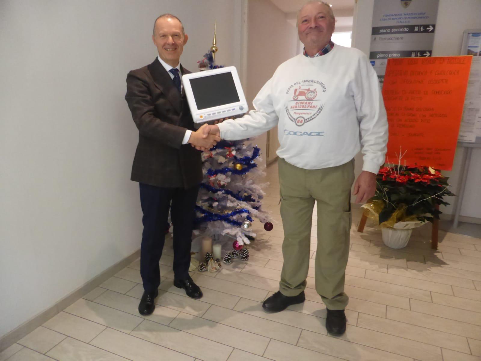 POMPONESCO – L’Associazione Giovani Agricoltori di Pomponesco ha donato alla Fondazione Mazzucchini un monitor multi-parametrico che svolge diverse importanti funzioni: elettrocardiogramma, misurazione della pressione arteriosa, della frequenza cardiaca, della saturazione dell’ossigeno, della temperatura nonché degli atti respiratori. Questa apparecchiatura rappresenta un dono particolarmente gradito e prezioso: la struttura infatti non disponeva di questa strumentazione, il cui acquisto era stato peraltro richiesto sia dal Direttore Sanitario Dott. Castagna che dal Medico di struttura Dott. Alberti. Una delegazione dell’Associazione si è recata martedì 24 dicembre presso la struttura per consegnare il monitor e fare gli auguri natalizi a tutti gli anziani; in quella occasione il Dott. Mazzi, cardiologo e membro del Consiglio di Amministrazione, ha illustrato le funzioni dell’apparecchiatura donata, ribadendone la grande utilità e l’ampio utilizzo che ne verrà certamente fatto sin da subito dai medici. Il Presidente, Claudio Formici, il Consiglio di Amministrazione, il personale e gli ospiti tutti hanno dunque espresso al Presidente dell’Associazione, Marziano Rossi, e a tutti i membri, i loro più sentiti ringraziamenti per l’importante gesto con il quale è stata dimostrata una grande attenzione, vicinanza e sensibilità verso gli anziani della nostra comunità.