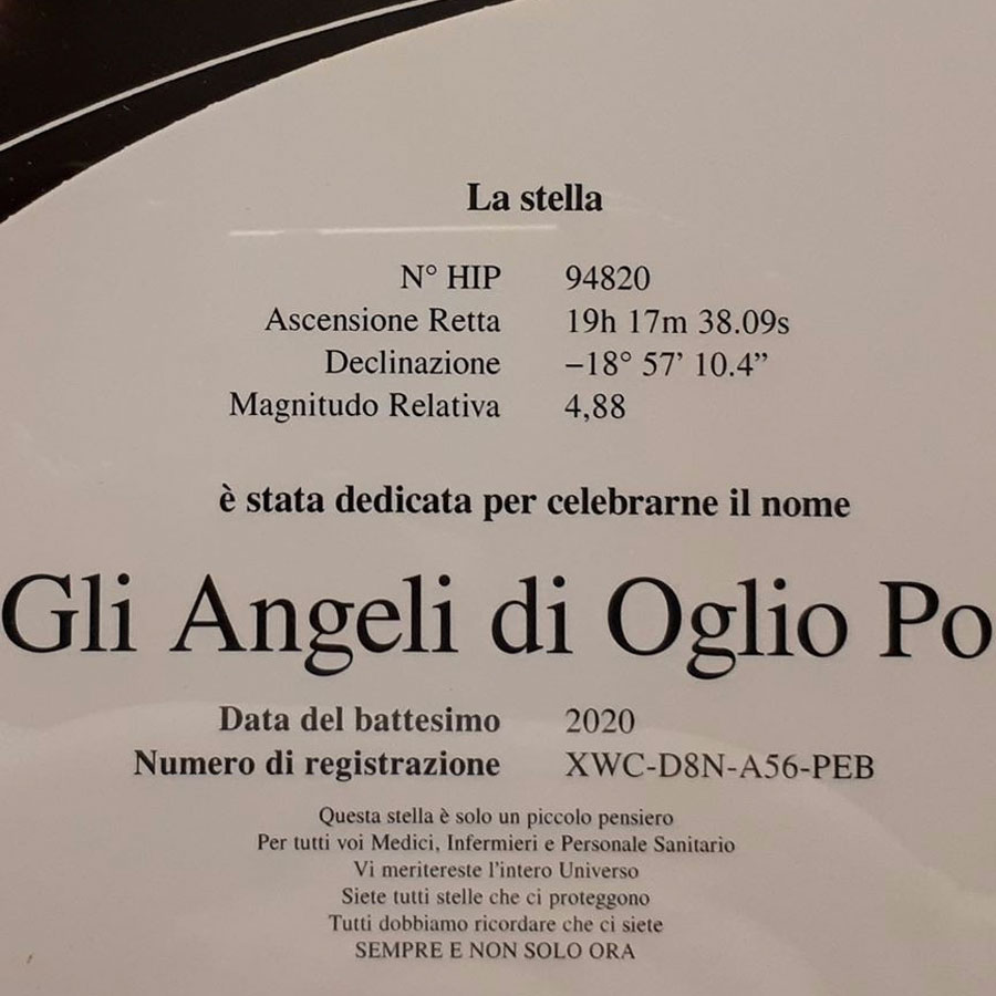 CASALMAGGIORE – Quando l’uomo cerca Dio e cerca un conforto, guarda al cielo. Adesso, guardando in alto, troverà un motivo per farlo, che si riallaccia anche alla medicina. Precisiamolo subito: il valore scientifico non c’è. Quello sociale però è immenso. E in questo caso ha più importanza. Una stella della Costellazione del Sagittario è stata dedicata agli Angeli dell’Oglio Po, ossia agli infermieri e ai medici che operano tutti i giorni in prima linea contro il Coronavirus, ormai da oltre un mese e mezzo. Un anonimo cittadino, presumibilmente di Casalmaggiore o del Casalasco, ha deciso di dedicare una stella a loro, per quello che stanno facendo, con una nota specifica che dice: “Questa stella è solo un piccolo pensiero. Per tutti voi, medici, infermieri e personale sanitario. Vi meritereste l’intero Universo. Siete tutti stelle che ci proteggono. Tutti dobbiamo ricordare che ci siete SEMPRE E NON SOLO ORA”.