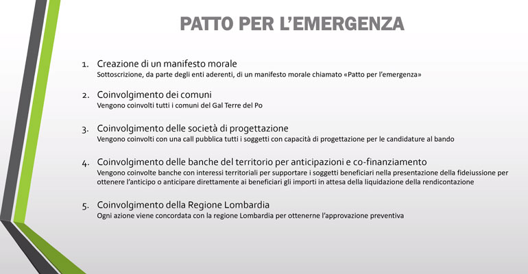 Quello che è stato creato è stato definito un manifesto morale tra i vari comuni aderenti, ossia una stretta di mano virtuale tra sindaci, che sono i primi avamposti e le prime antenne sul territorio, col coinvolgimento di Regione Lombardia. E pure delle banche come la BCC di Rivarolo Mantovano e la BCC Cremasco Mantovana, senza scordare la Montepaschi, tutte disposte all’anticipo sia del 90% del contributo sia del 10% per completare il finanziamento che, con i chiari di luna di questa emergenza, può risultare una somma importante.