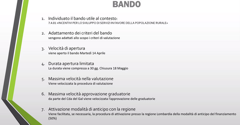 “Siamo stati il primo Gal a porci il problema – ha introdotto Meneghetti – e per questo abbiamo ricevuto anche i complimenti da Regione Lombardia. Quello che vogliamo fare è aiutare a sviluppare progetti in questa fase emergenziale, sfruttando la misura 7.4.01, rimodulata con gli avanzi dei precedenti bandi e alcune iniezioni di liquidità forti, che saranno distribuite”. Il bando è già aperto e durerà fino al 18 maggio: perché durerà così poco tempo? Proprio per velocizzare l’assegnazione delle risorse ai progetti che sapranno meritarsele, vincendo le lentezze e le cesoie della burocrazia con grande rapidità. Da qui la volontà di una valutazione veloce da parte della commissione e pure di una graduatoria che sarà stilata con immediatezza. Erano presenti per i vari comuni il sindaco di Casalmaggiore Filippo Bongiovanni, di Viadana Alessandro Cavallari, di Commessaggio Alessandro Sarasini, di Marcaria Carlo Alberto Malatesta, il vice di Rivarolo Mantovano Ugo Enrico Guarneri, il sindaco di San Giovanni in Croce Pierguido Asinari, di San Martino dall’Argine Alessio Renoldi e di San Giacomo delle Segnate Giuseppe Brandani.